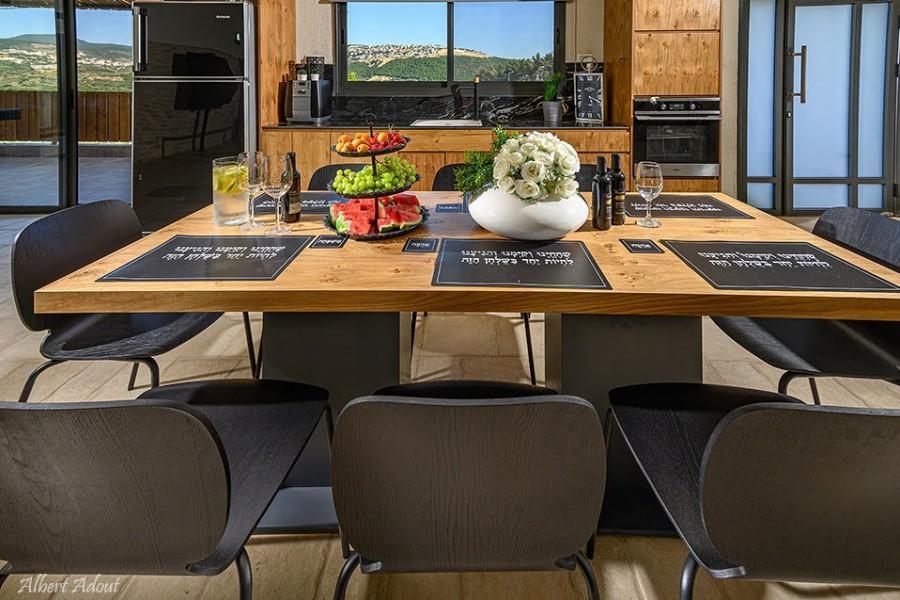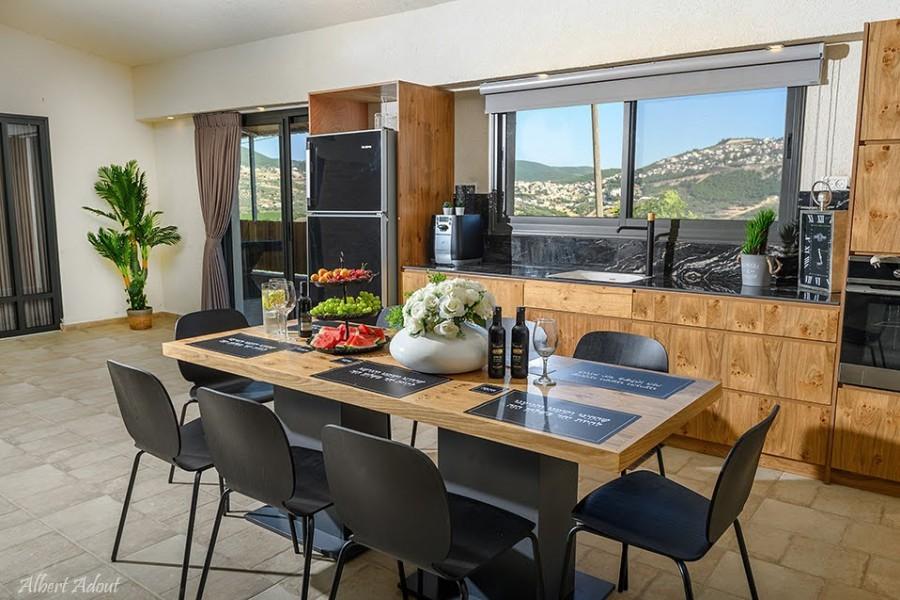 מטבח מאובזר ובו: מקרר, כיריים חשמליות, מכונת אספרסו, פלטת שבת, מתקן מים, תנור אפייה, כלי הגשה, סירים, מחבתות, מיקרוגל.