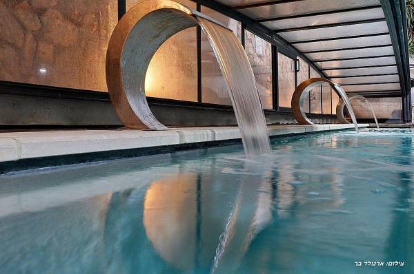 בריכת שחייה בגודל 10 על 4 מטר (מחוממת ומקורה בחורף) עם מפלי מים
