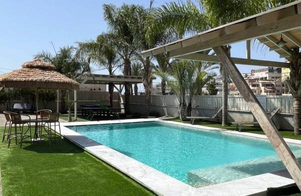 חצר מטופחת עם פרגולה גדולה, ערסלים, מיטות שיזוף ונדנדות