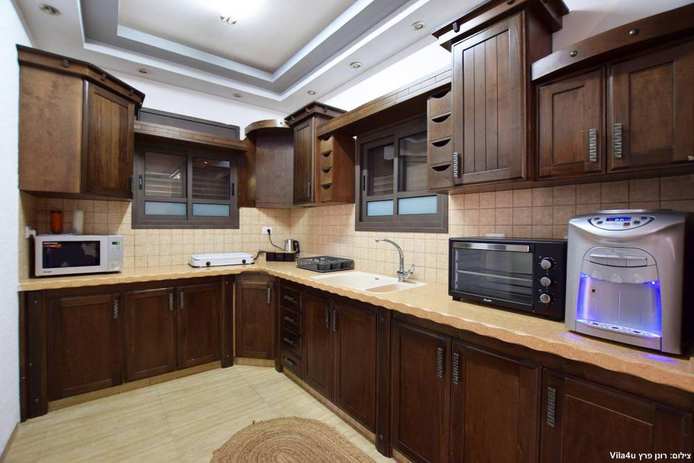 מטבח מאובזר הכולל: מקרר, טוסטר אובן, מיקרוגל, בר מים, כיריים חשמליות, קומקום חשמלי וכלי אוכל והגשה