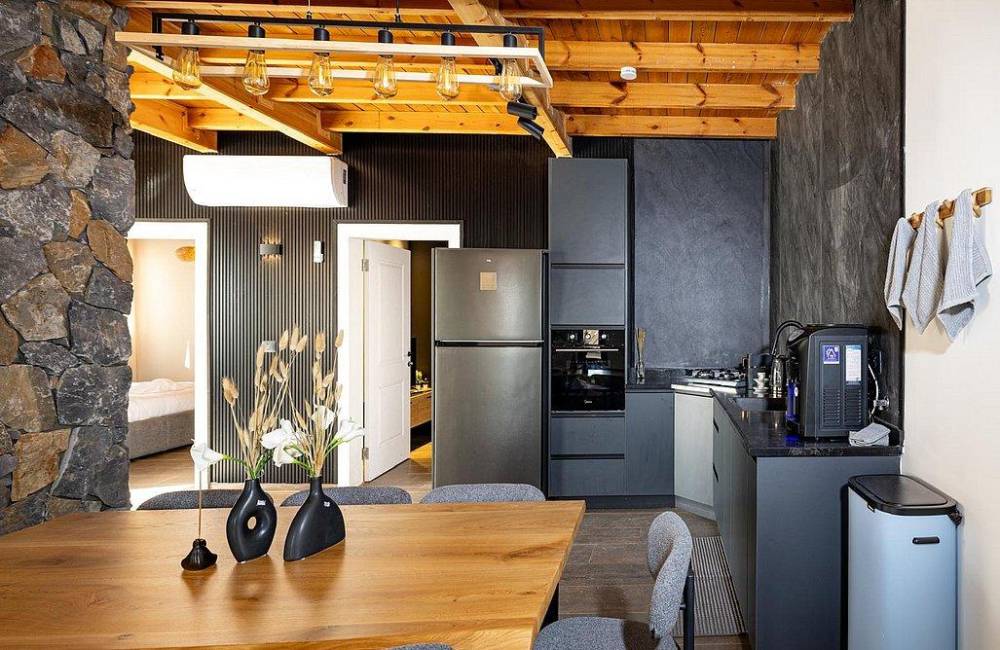 מטבח מאובזר: מקרר, תנור, מיקרוגל, קולר מים, מכונת אספרסו, כיריים גז, קומקום חשמלי
