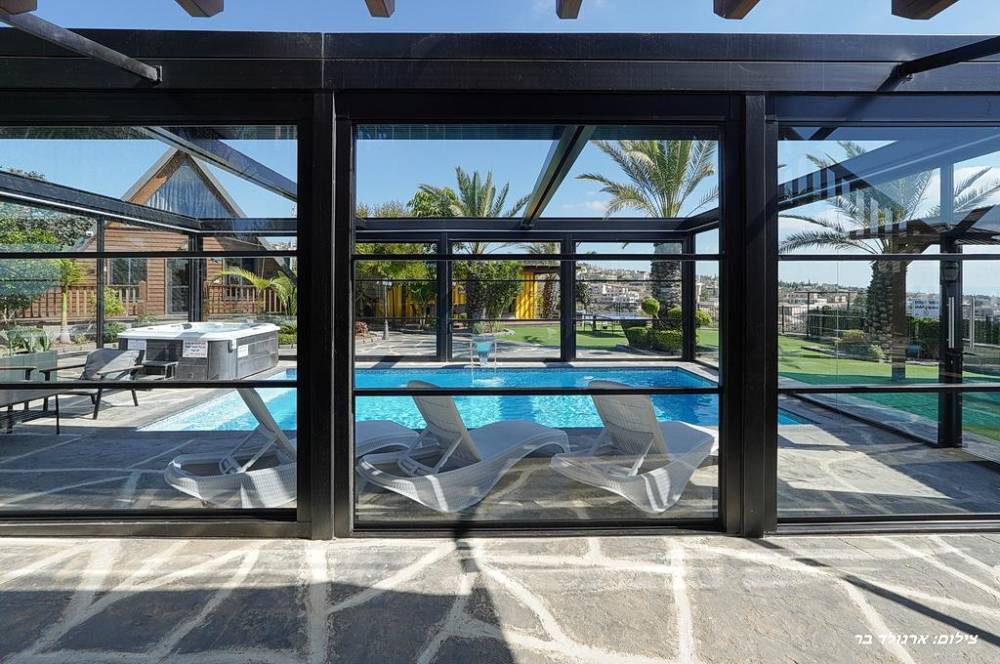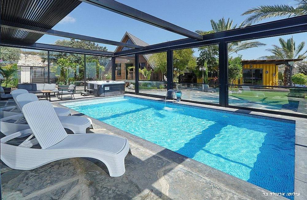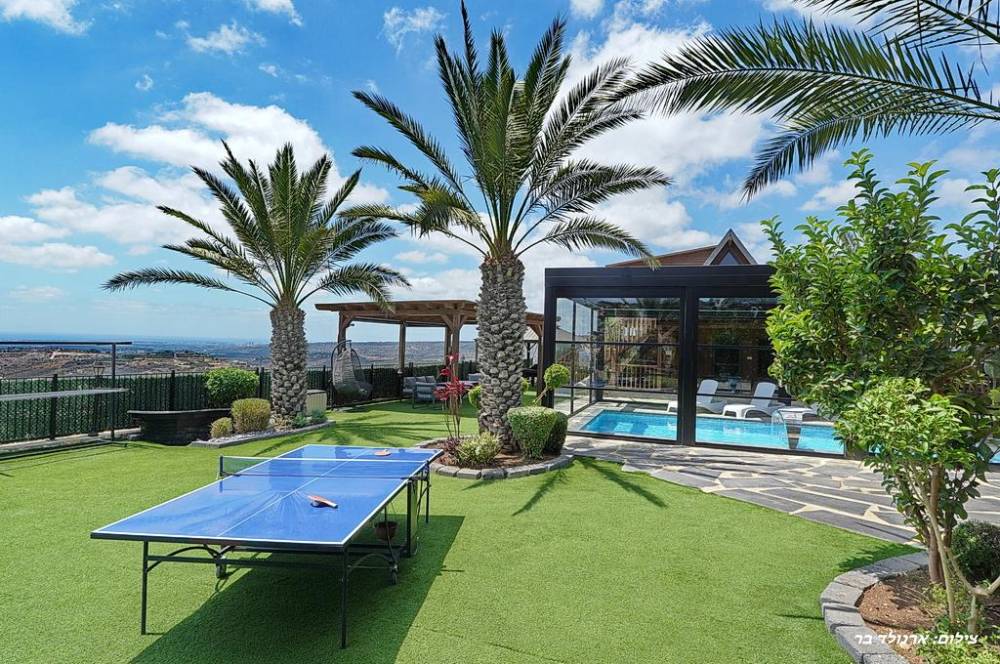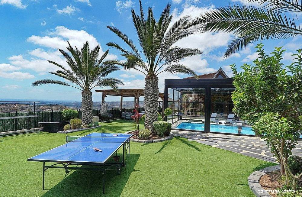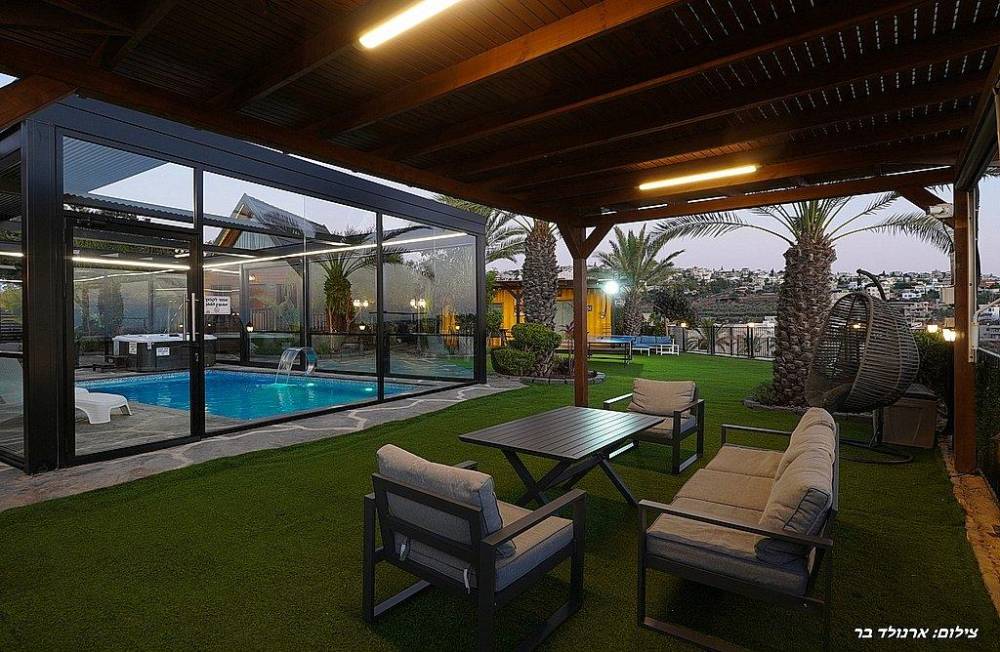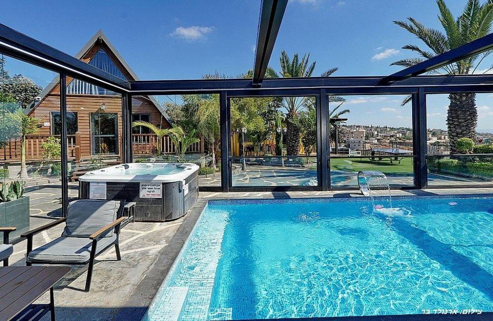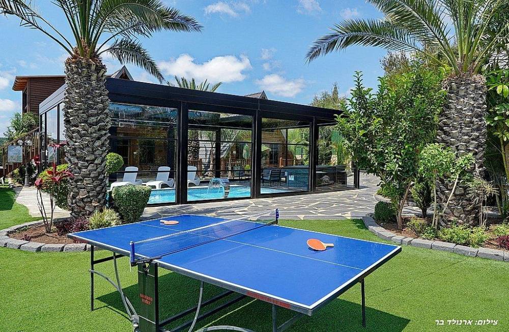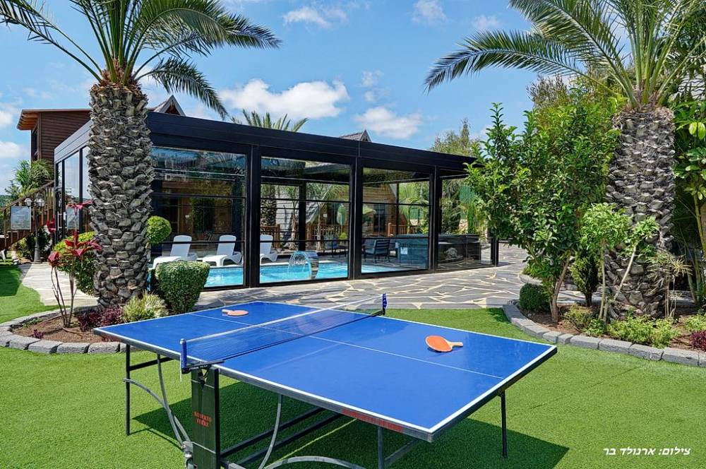במתחם החיצוני תוכלו להנות מבריכת שחייה מחוממת ומקורה, שולחן פינג פונג ואף גם טרמפולינה לילדים.