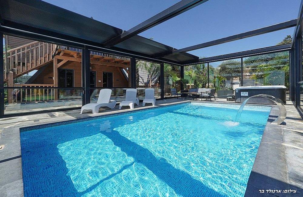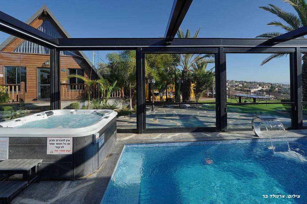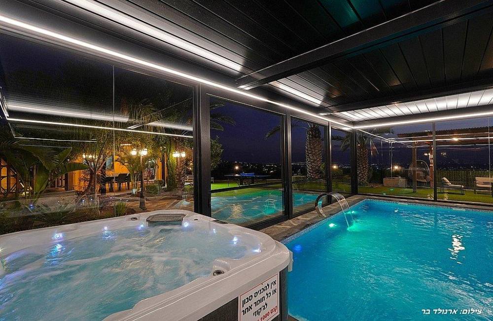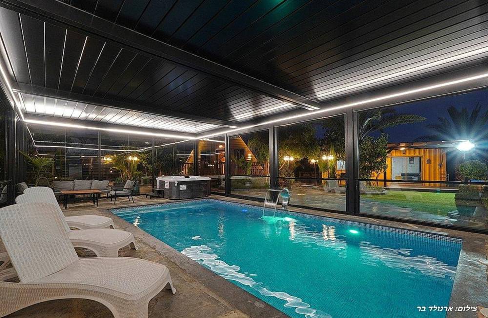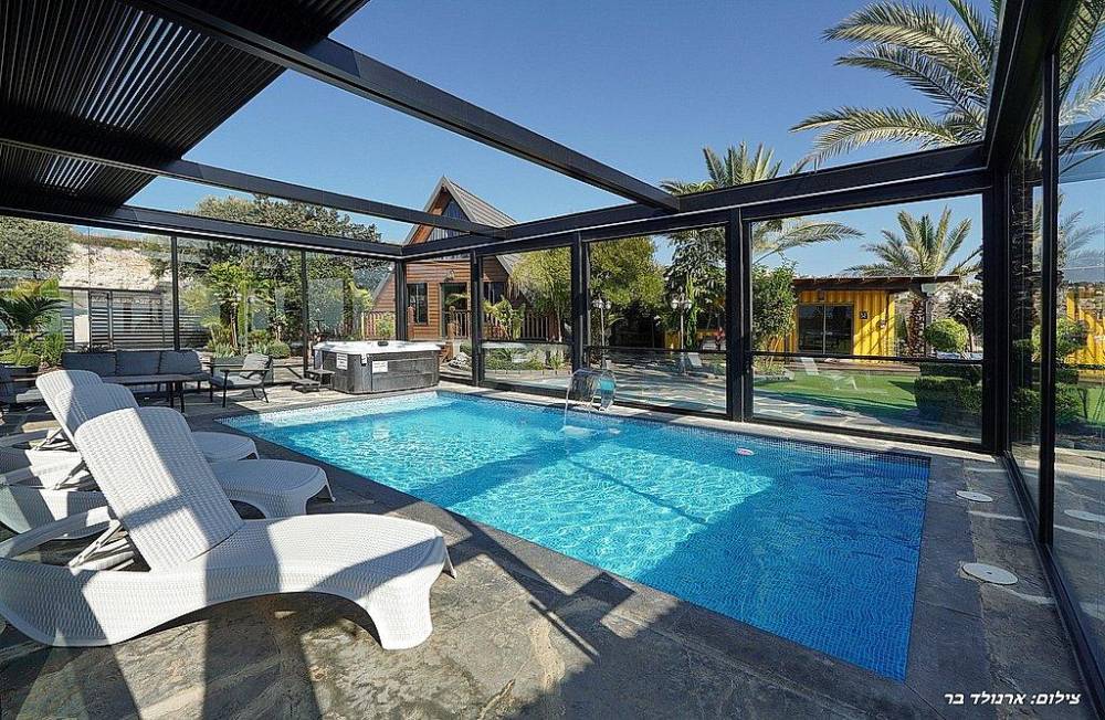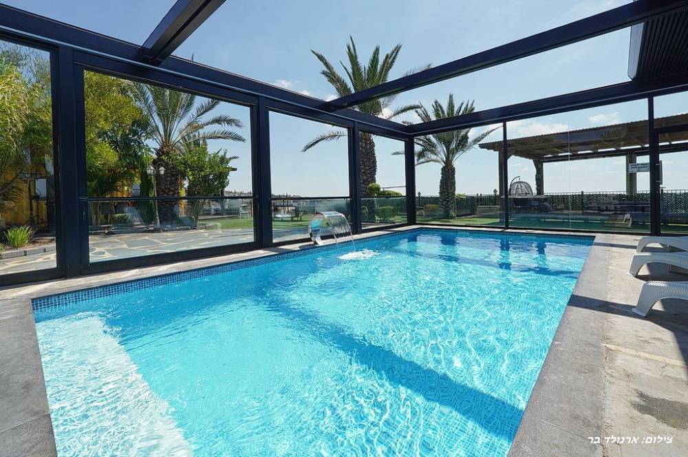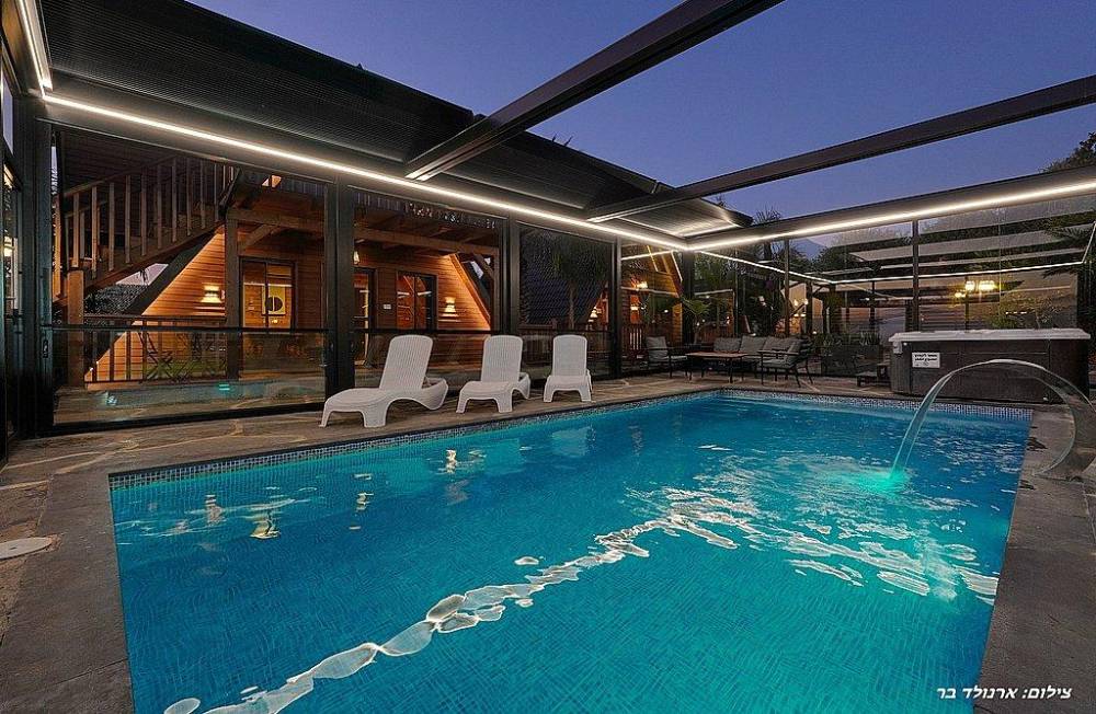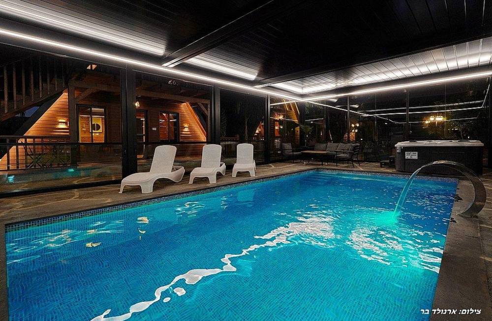במתחם החיצוני תוכלו להנות מבריכת שחייה מחוממת ומקורה, שולחן פינג פונג ואף גם טרמפולינה לילדים.