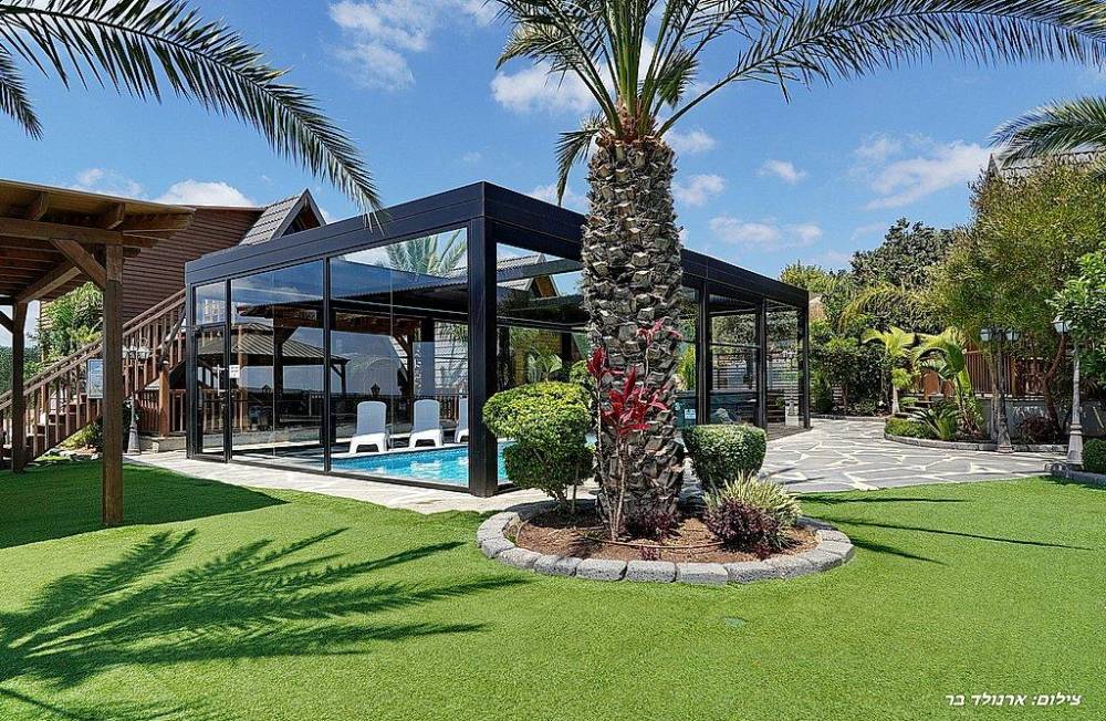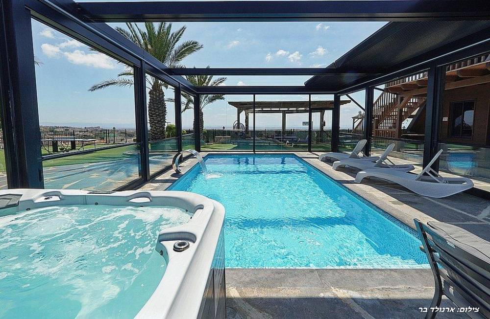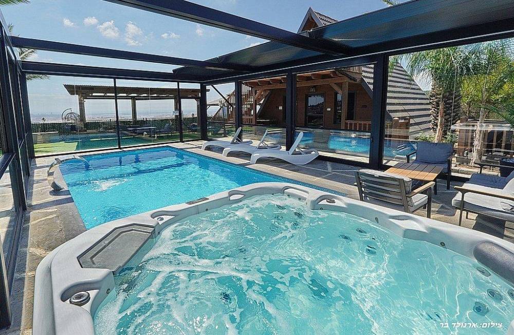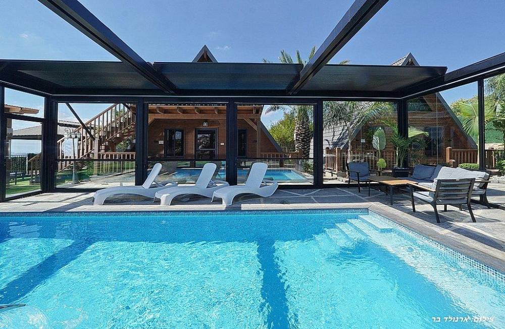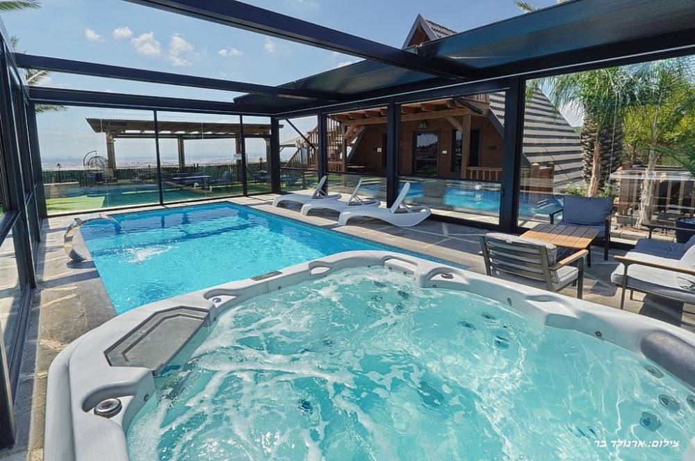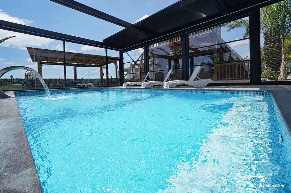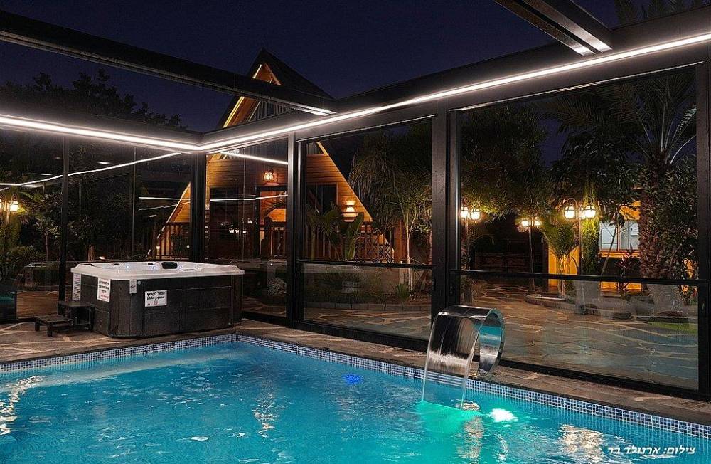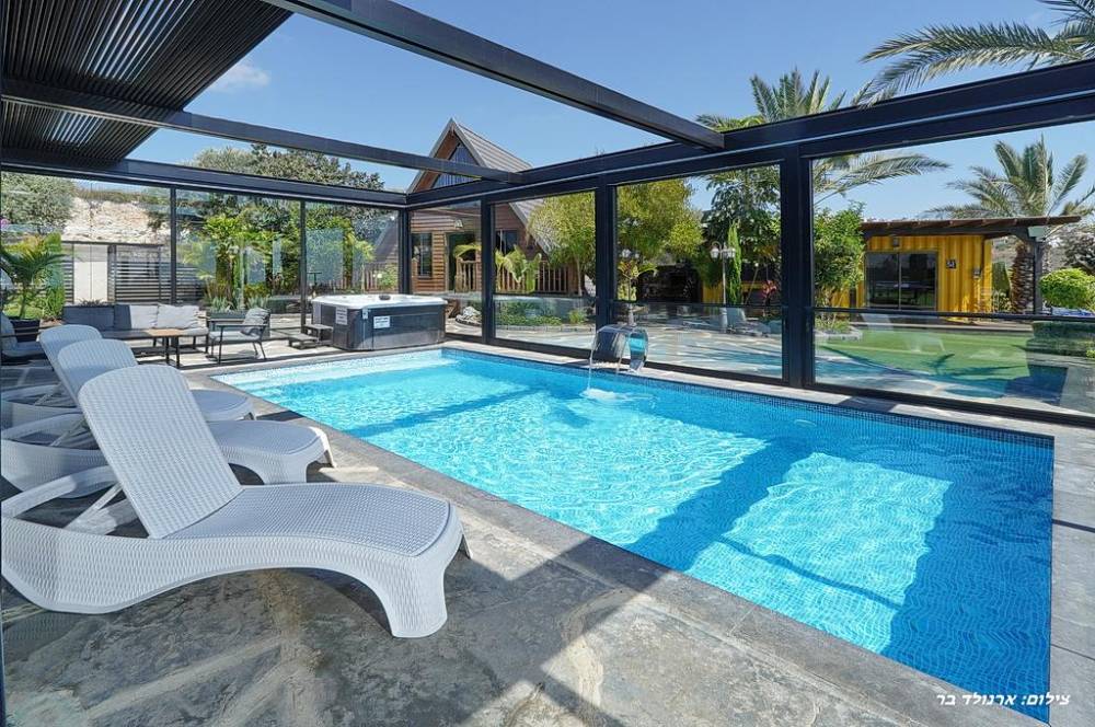 במתחם החיצוני תוכלו להנות מבריכת שחייה מחוממת ומקורה, שולחן פינג פונג ואף גם טרמפולינה לילדים.