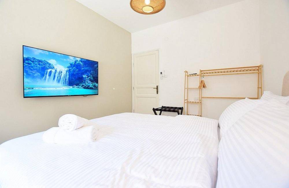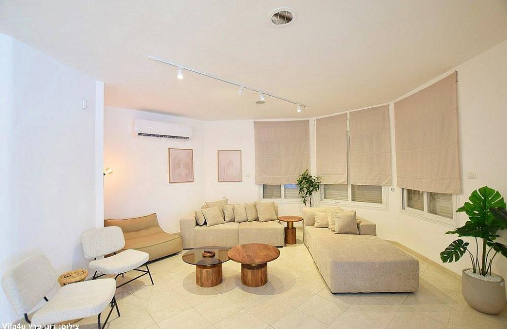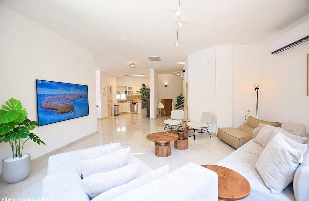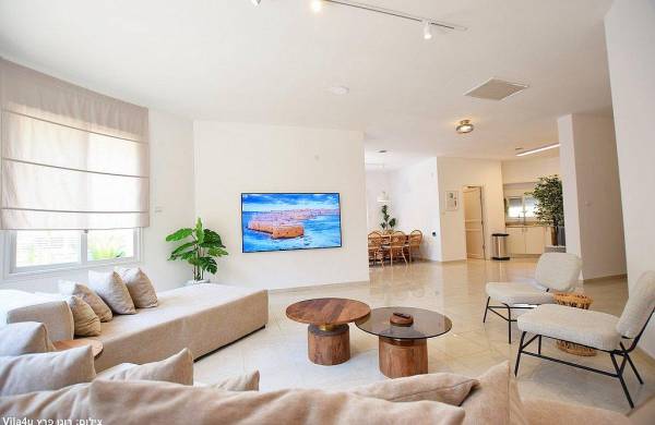 - סלון מרווח עם מסך טלוויזיה בגודל 75 אינץ' וחיבור לפרי טיוי.