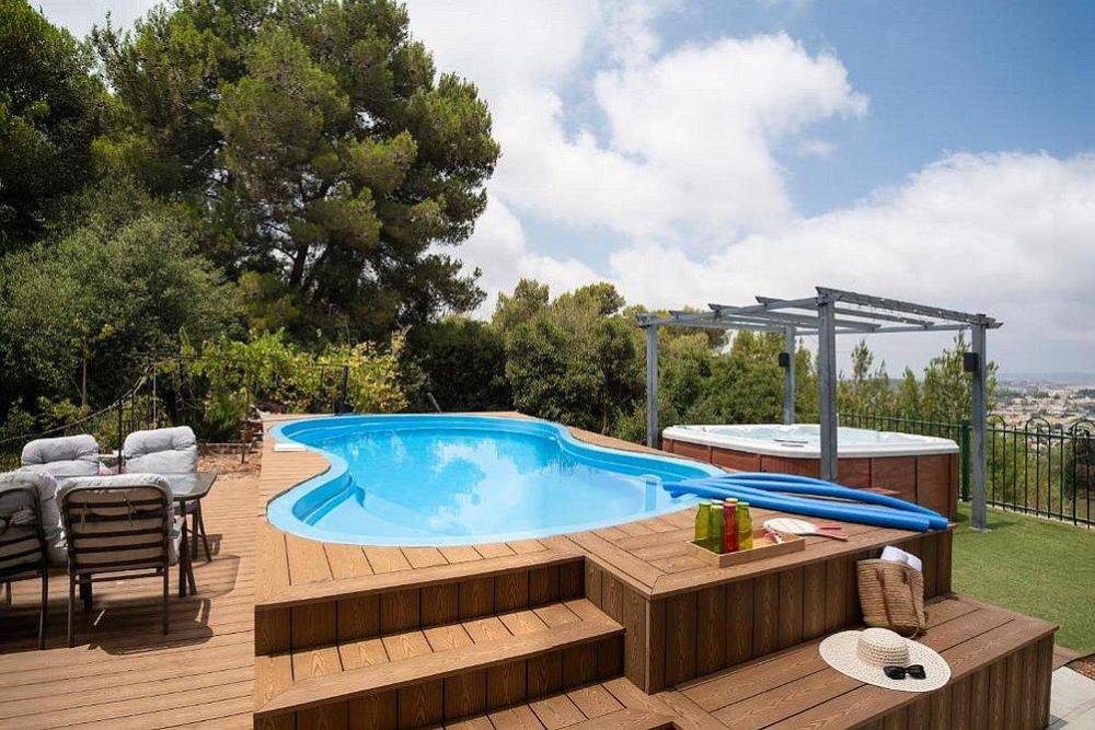 חצר גדולה עם מתחם דק ובריכת שחייה