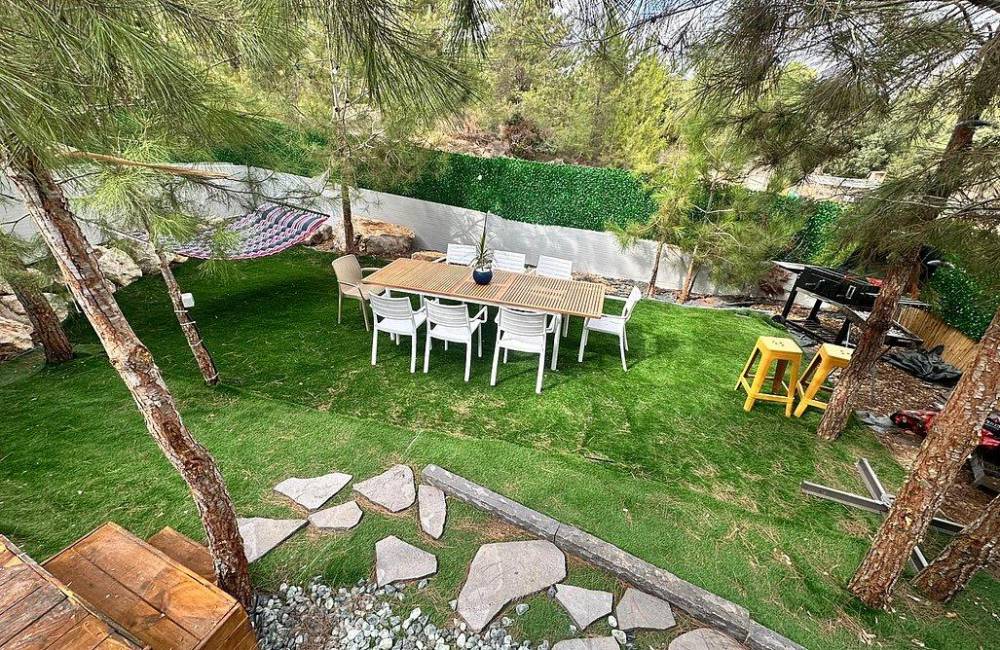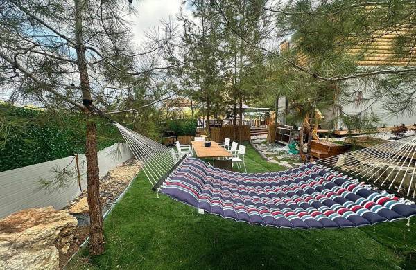 חצר גדולה, מדשאות, ערסל ופינות ישיבה מוצלות