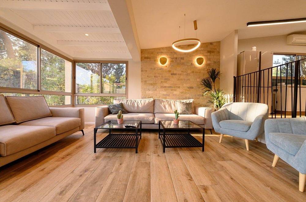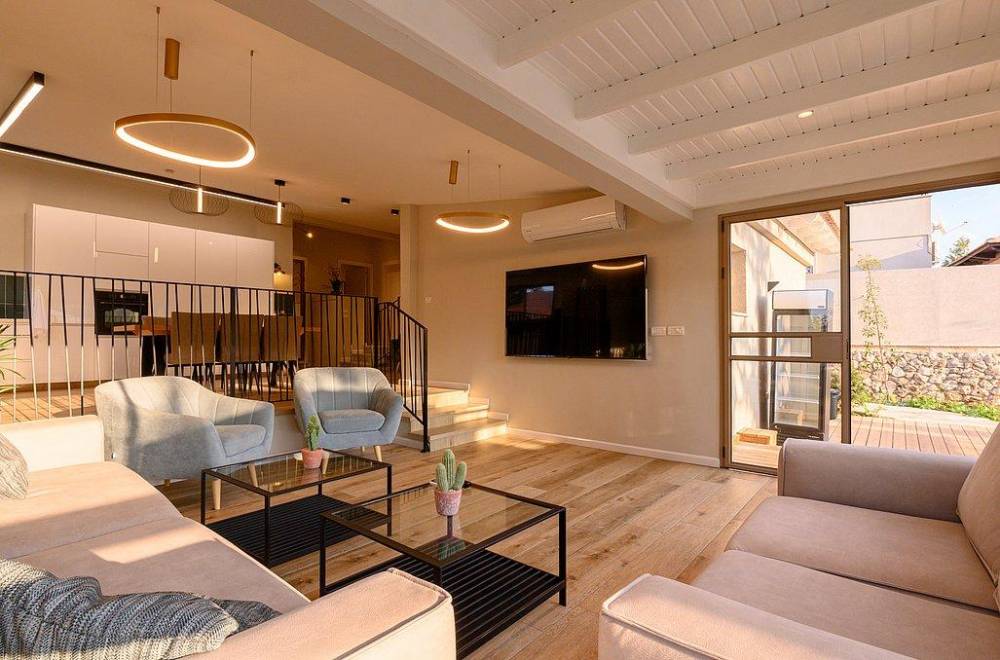 סלון מעוצב עם מערכת ישיבה ומולה טלוויזיה בגודל 74 אינץ' עם חיבור לערוצי פרטנר ונטפליקס
