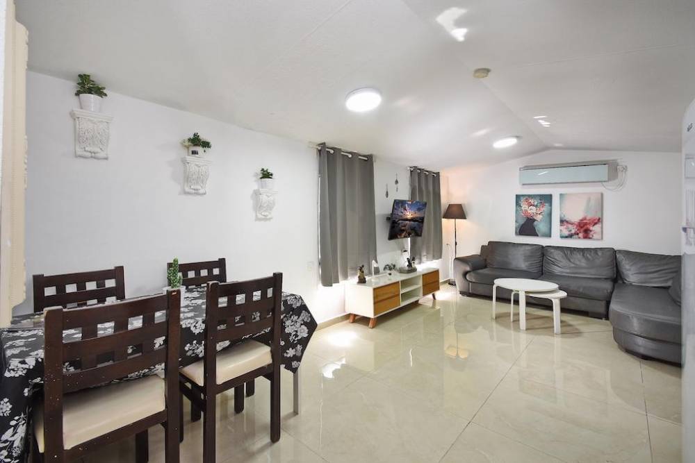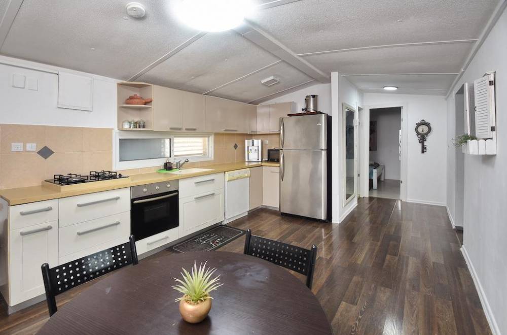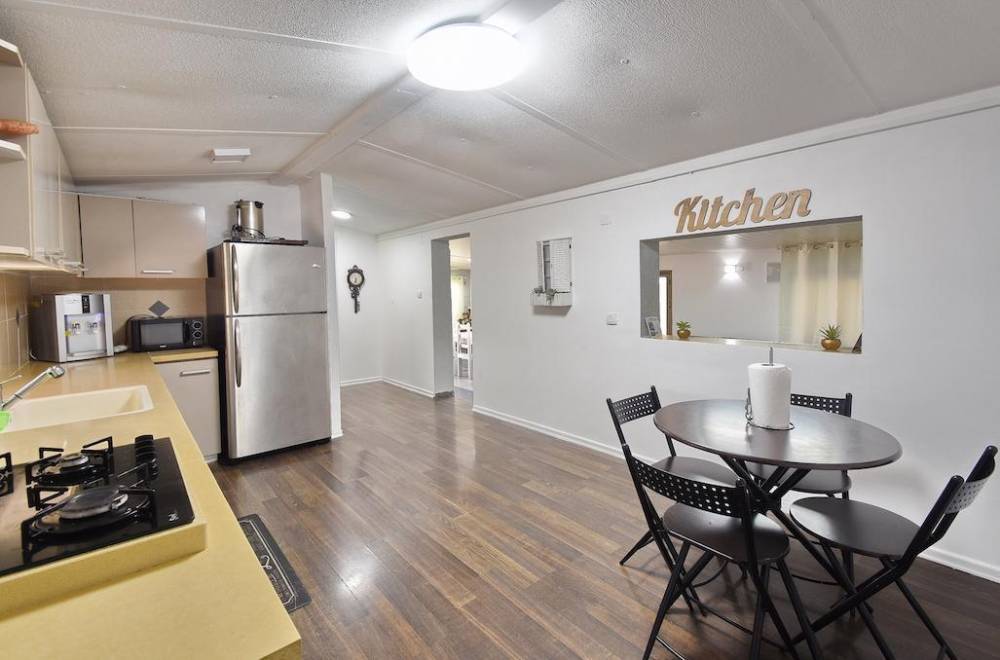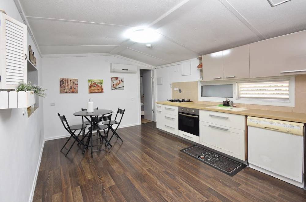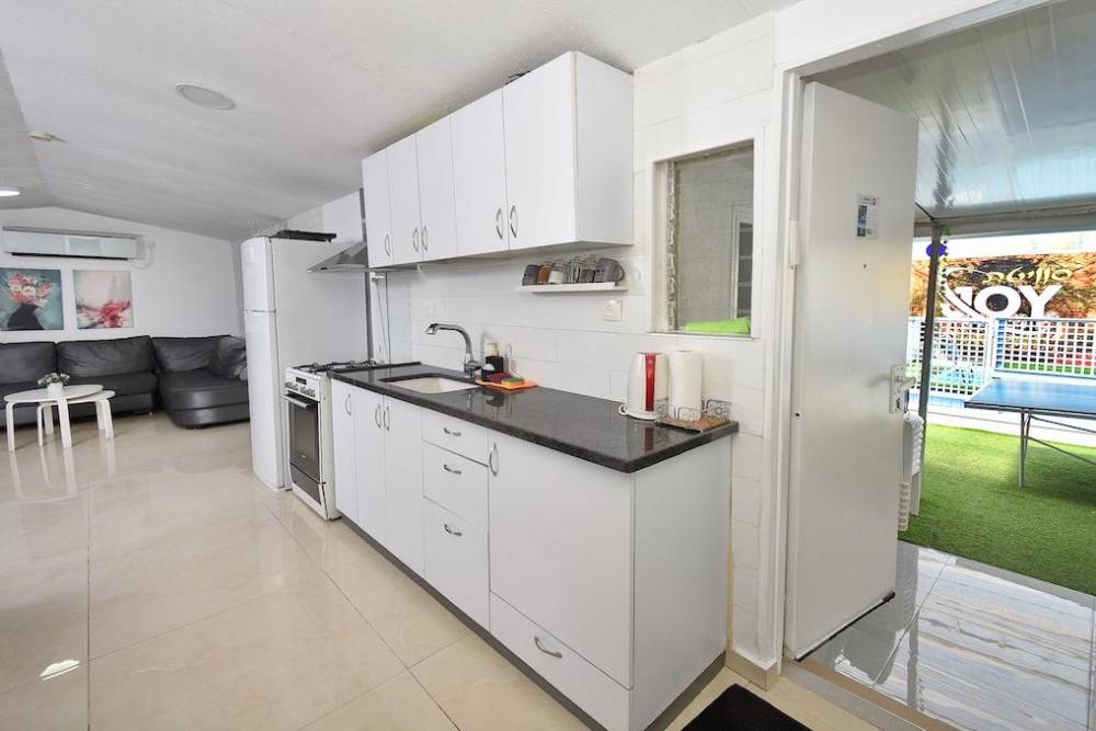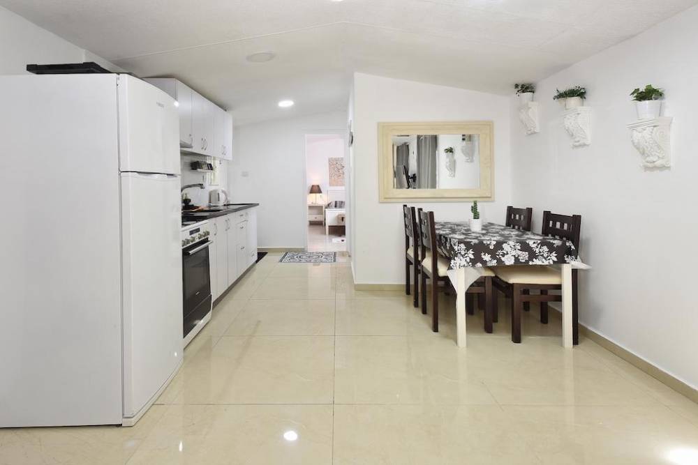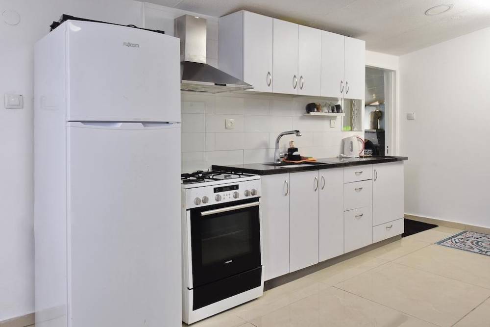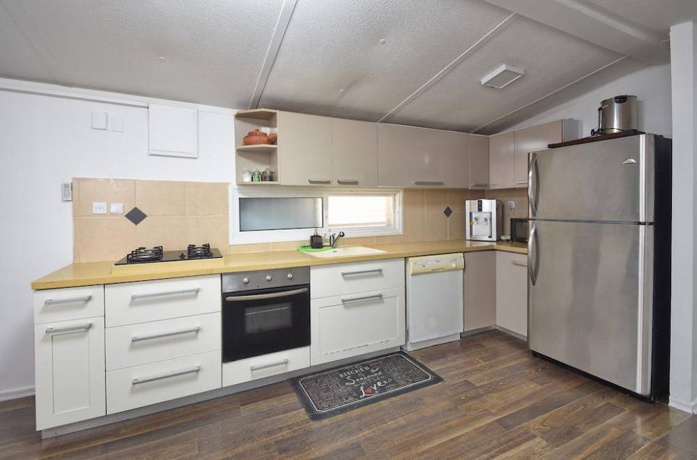 מטבח מאובזר בכל הדרוש כולל: מטבח, מקרר, מיקרוגל תנור מדיח, כלי אוכל והגשה