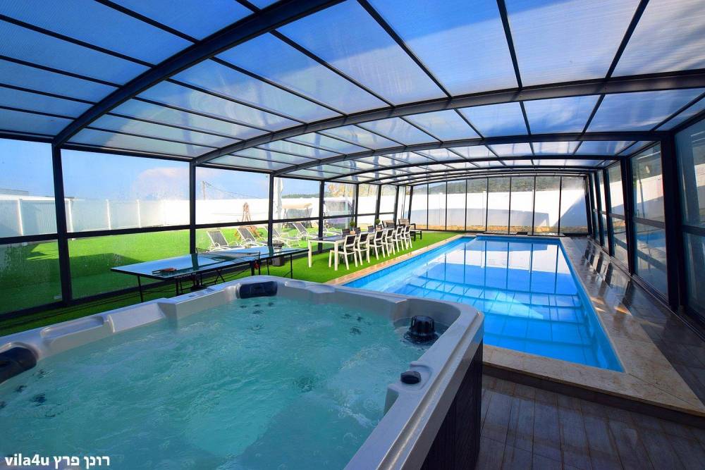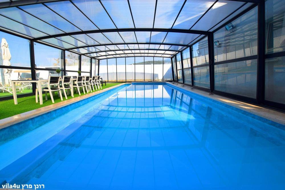 בריכת שחייה אינפיניטי בגודל 12 מ"ר הנשפכת לבריכת שכשוך פעוטות , הבריכה הינה בטיחותית, מחוממת ומקורה בקירוי זכוכית הנפתח ונסגר