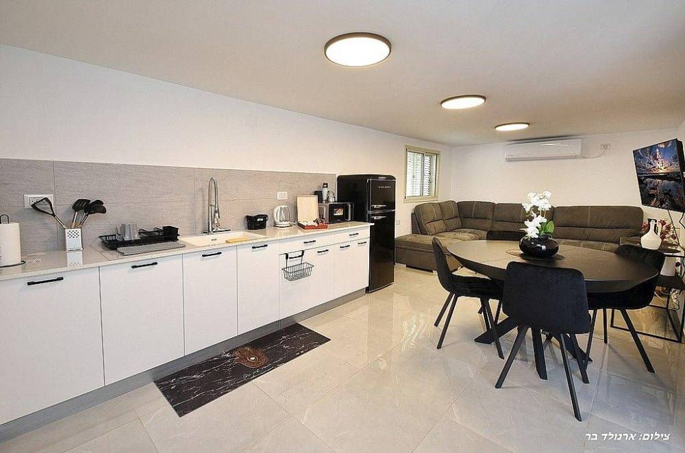 מטבח פנימי כולל: מקרר, תנור אפייה, מדיח כלים, כיריים גז, מיקרוגל, תמי 4, מכונת אספרסו, כלי הגשה וסכום