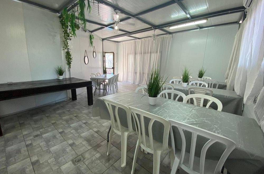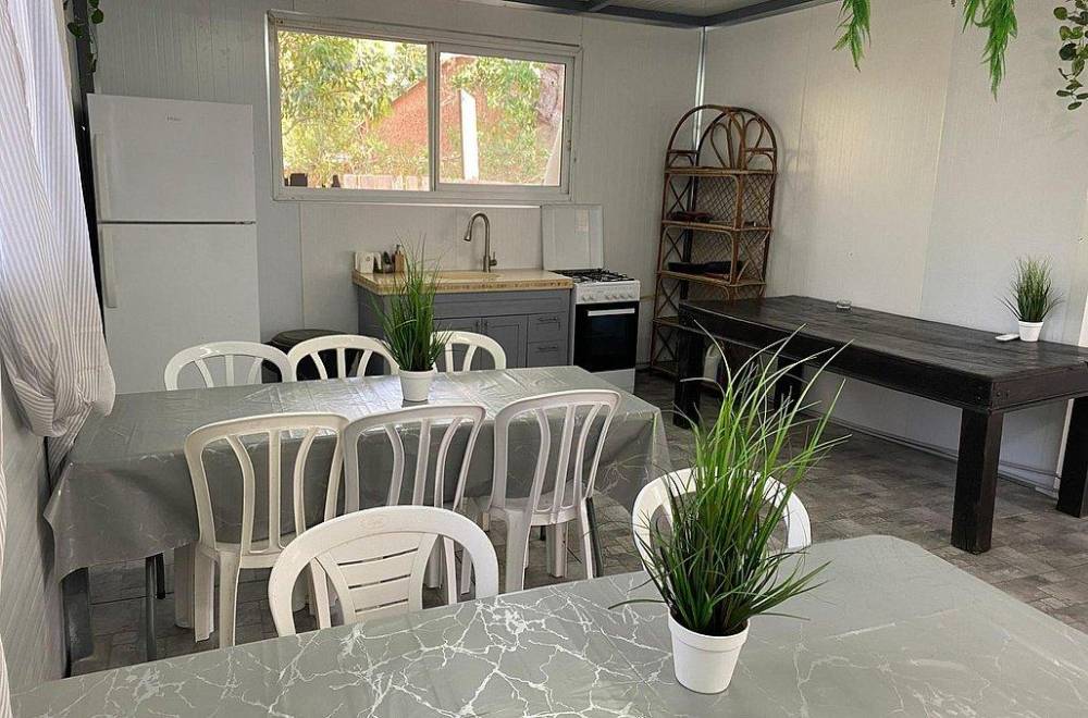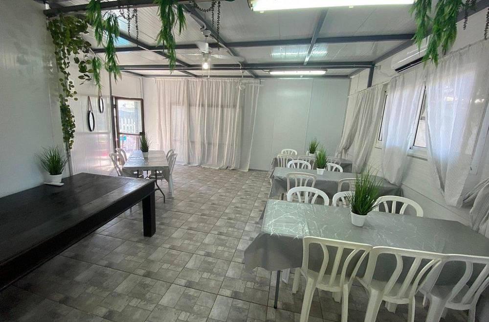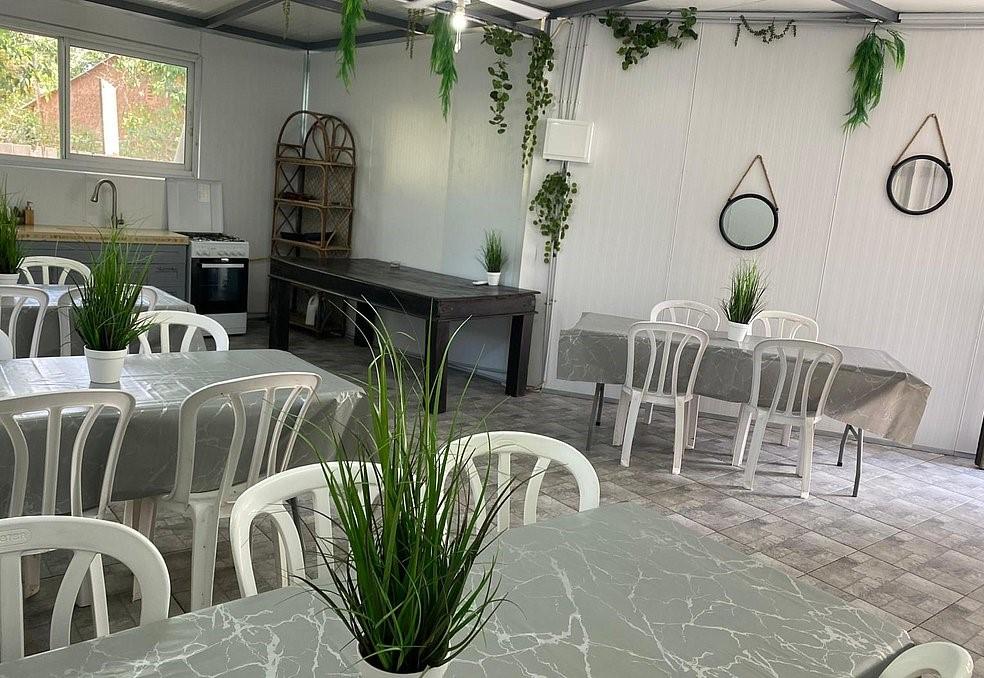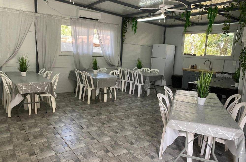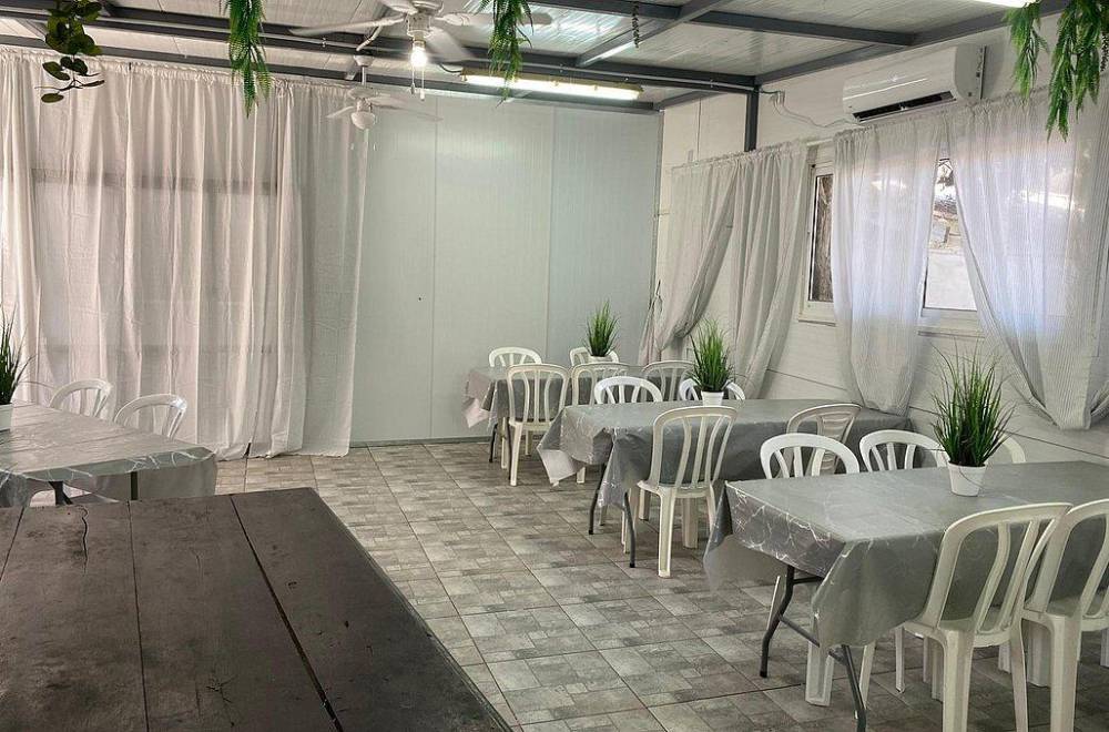 חדר אוכל ממוזג עם כיסאות שולחנות ומטבח מאובזר