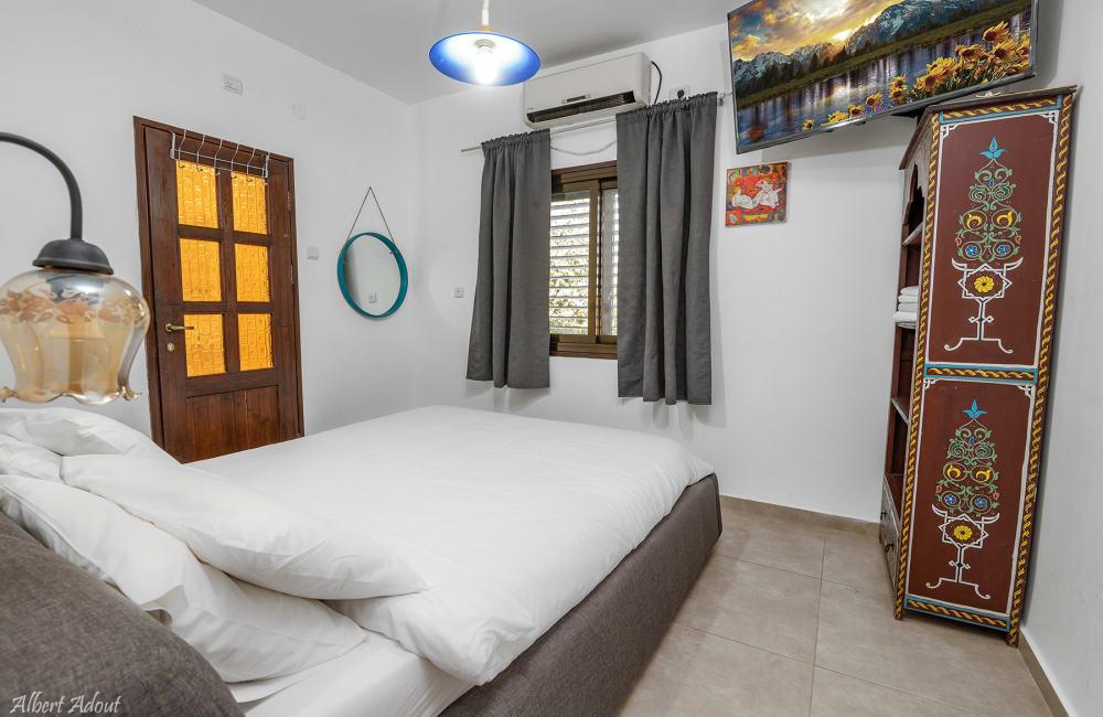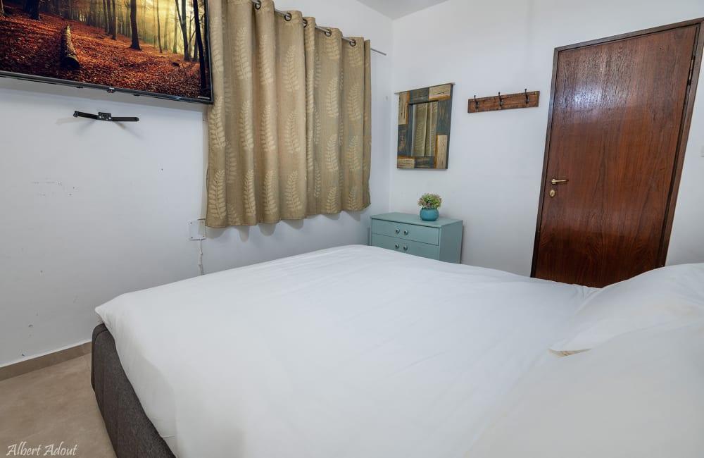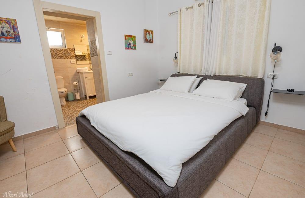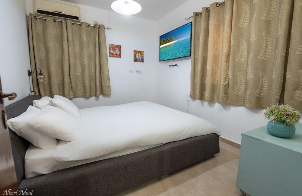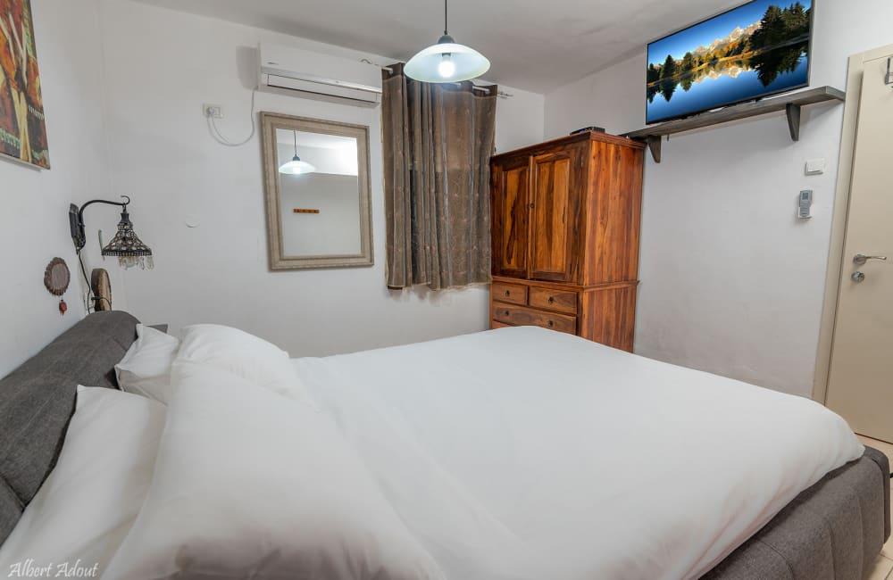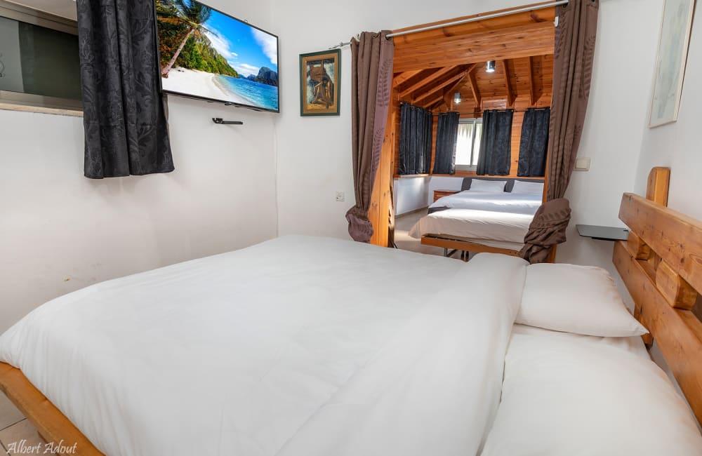 אבזור חדרי השינה: מיטה זוגית מוצעת, מיזוג אוויר, ארון לבגדים, שידות, מסך צפייה