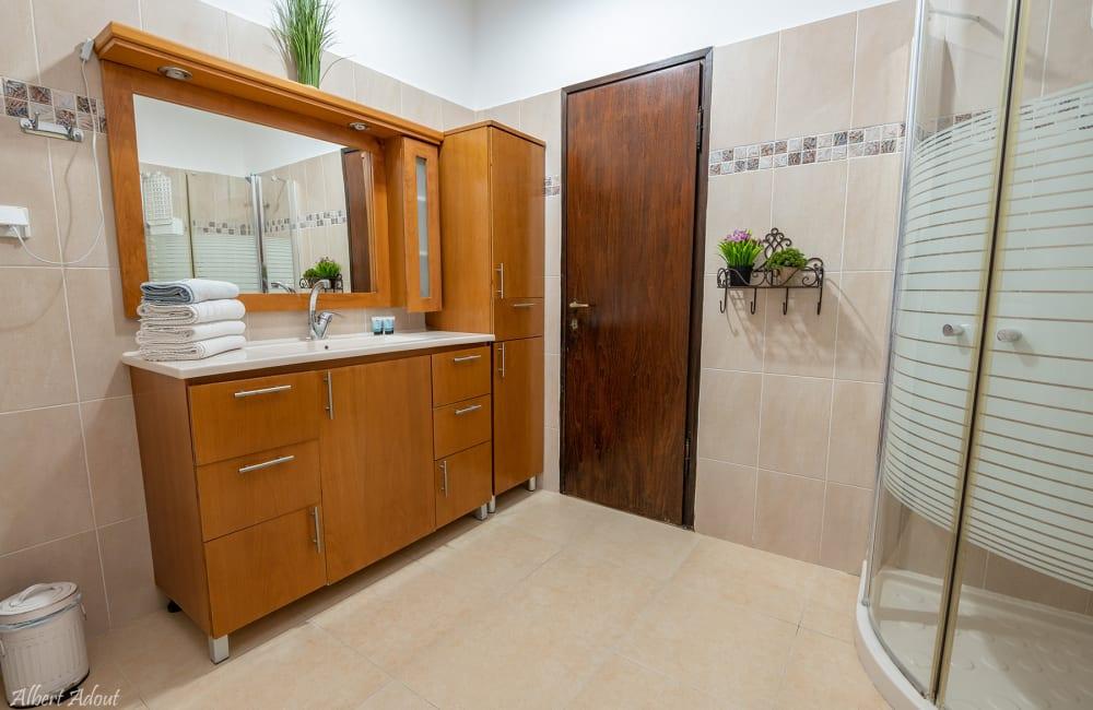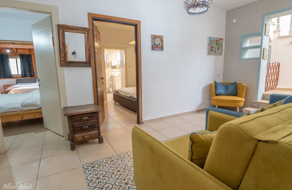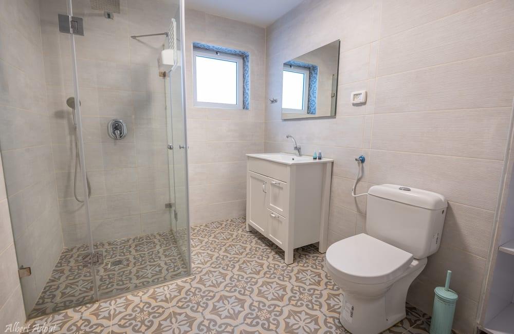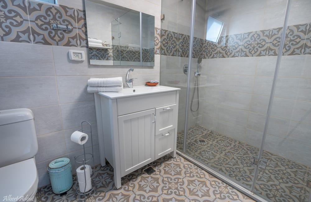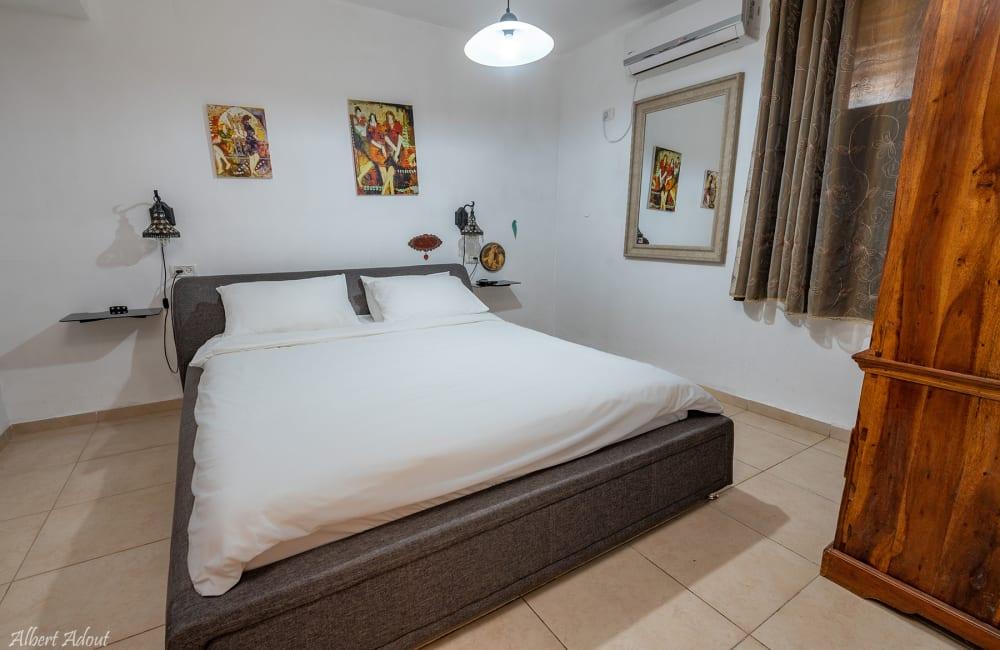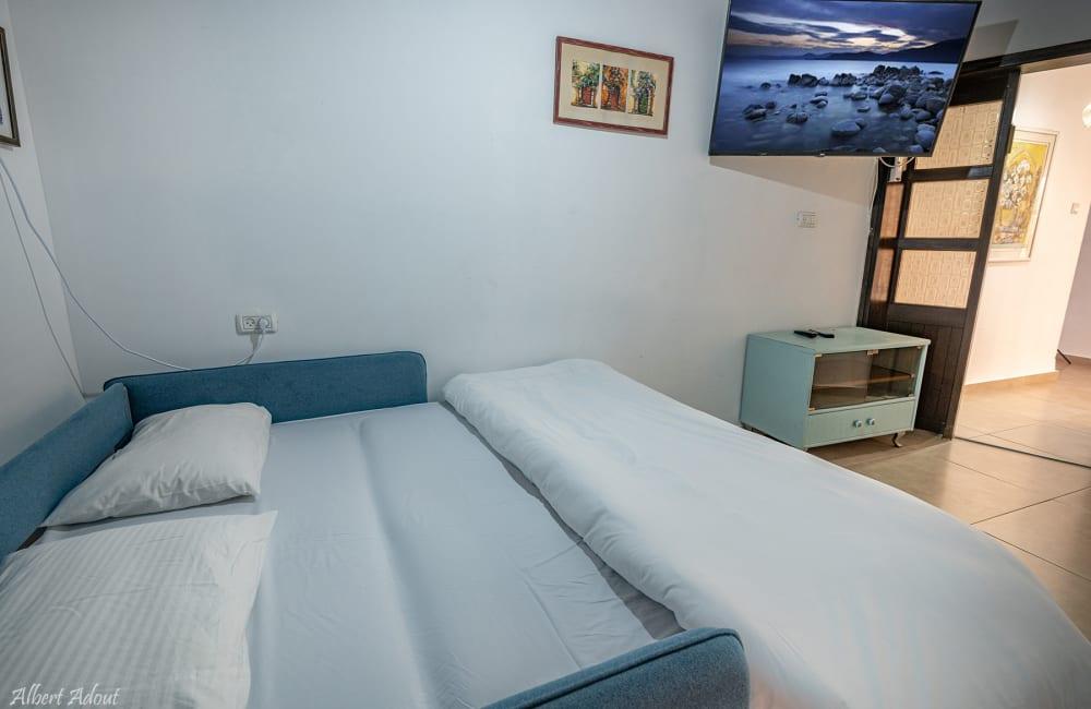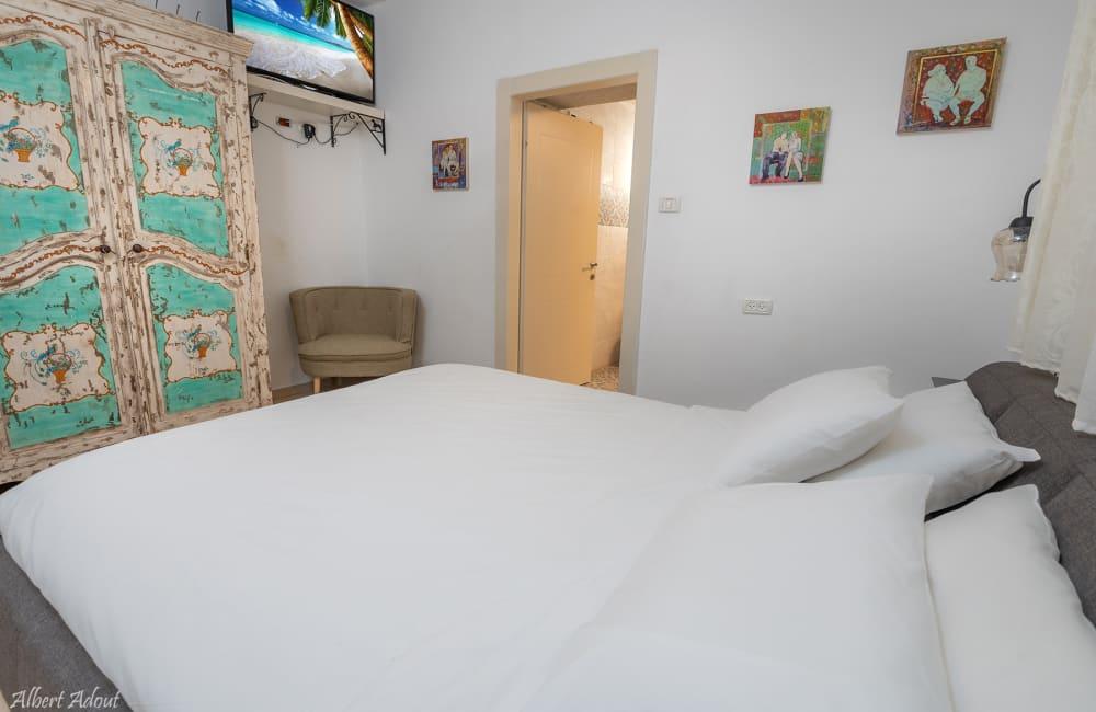 אבזור חדרי השינה: מיטה זוגית מוצעת, מיזוג אוויר, ארון לבגדים, שידות, מסך צפייה