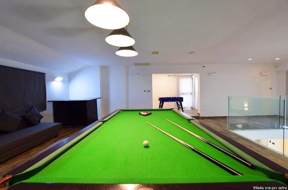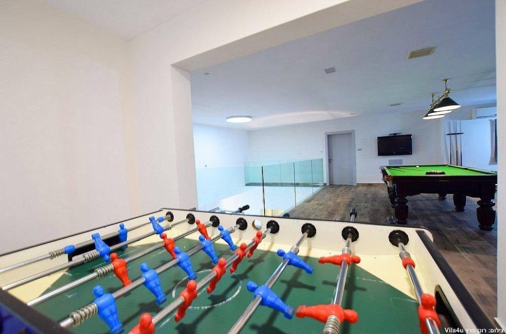 קומת פנאי עם שולחן כדורגל, שולחן סנוקר ופינות ישיבה
