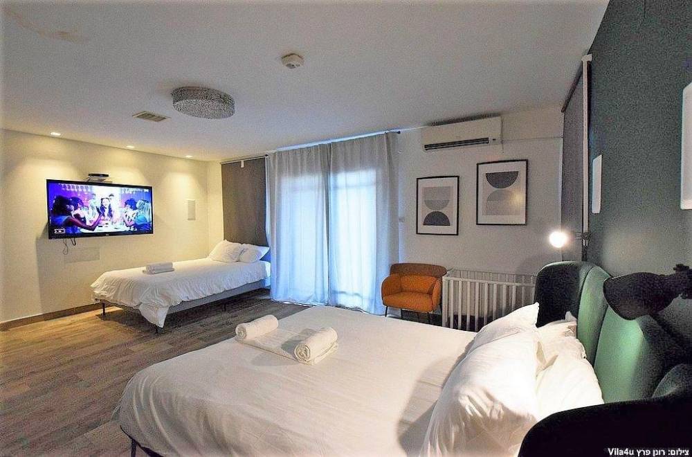 מיטה זוגית נוחה, ארונות ושידות אחסון, טלוויזיה, מיזוג אוויר ומרפסת (ל- 4 מהחדרים קיים חדר רחצה פרטי)