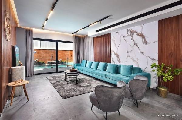 סלון עם מערכת ישיבה נוחה, מסך טלוויזיה עם חיבור לערוצי YES.