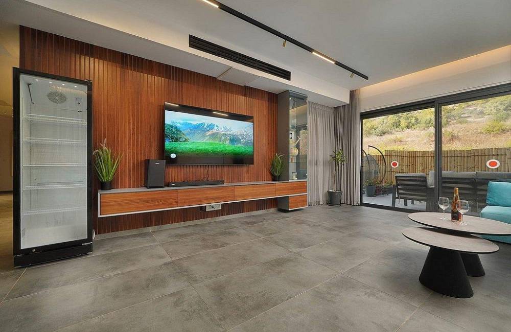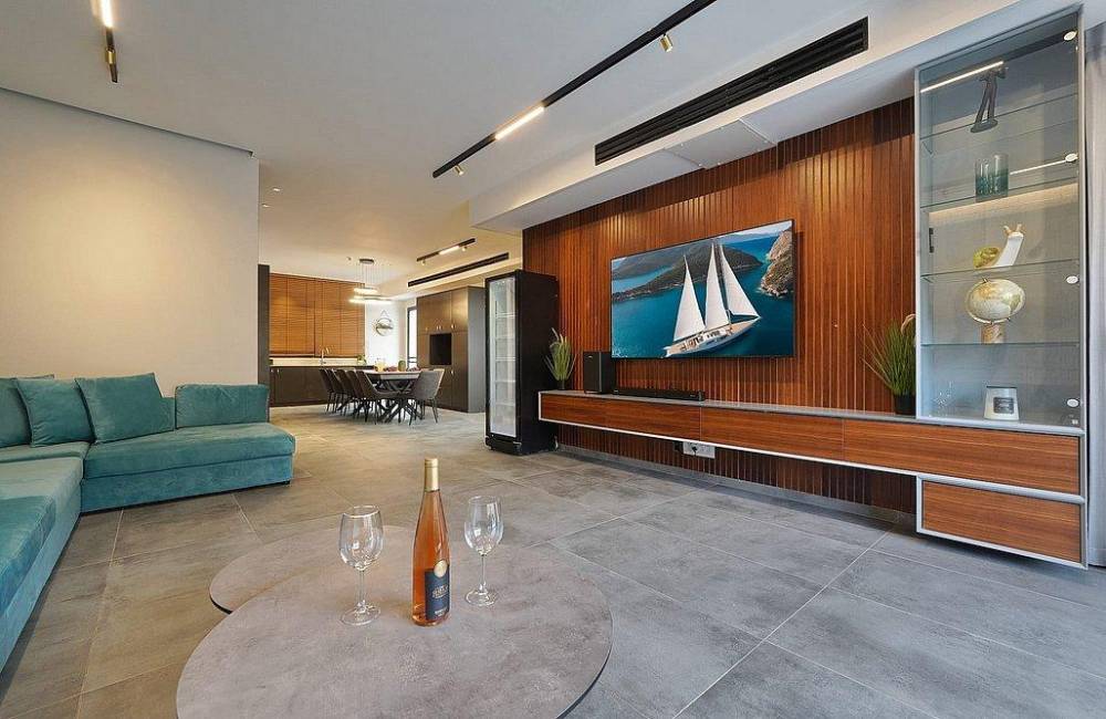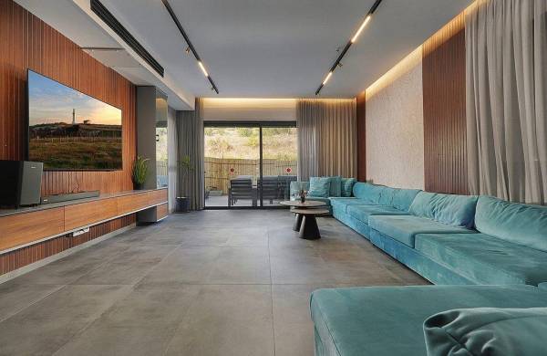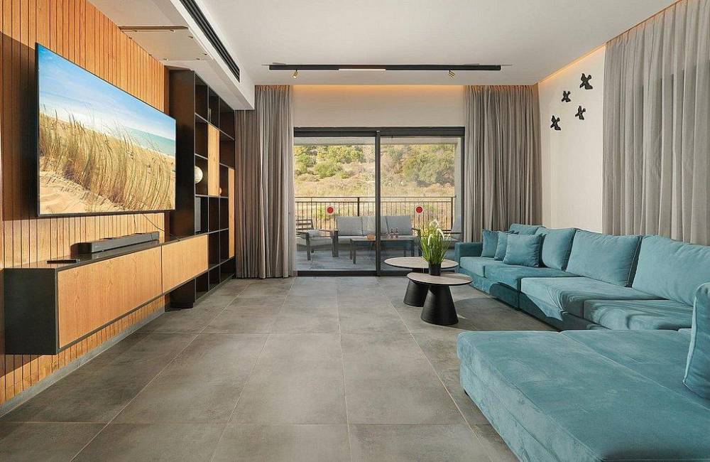 סלון עם מערכת ישיבה נוחה, מסך טלוויזיה מחובר לערוצי YES