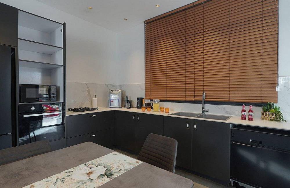 מטבח מאובזר עם 2 תנורים, 2 כיורים, כיריים גז, מיקרוגל, מקרר, תמי4, כלי אוכל והגשה