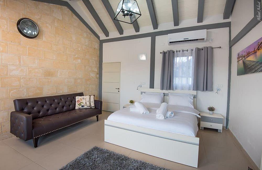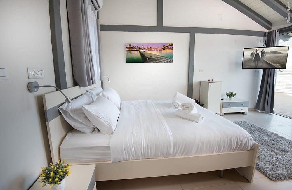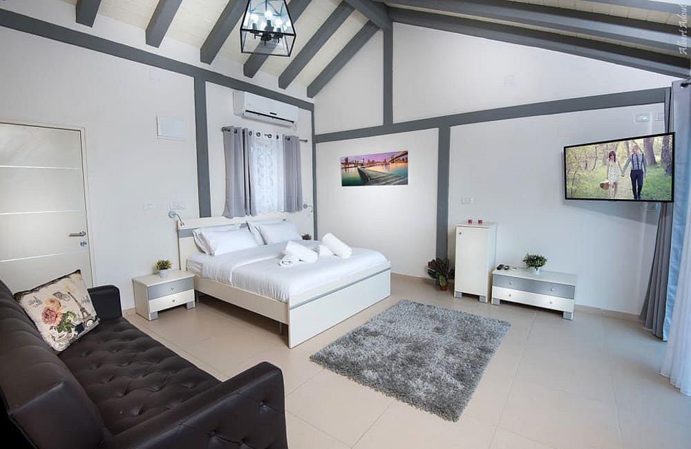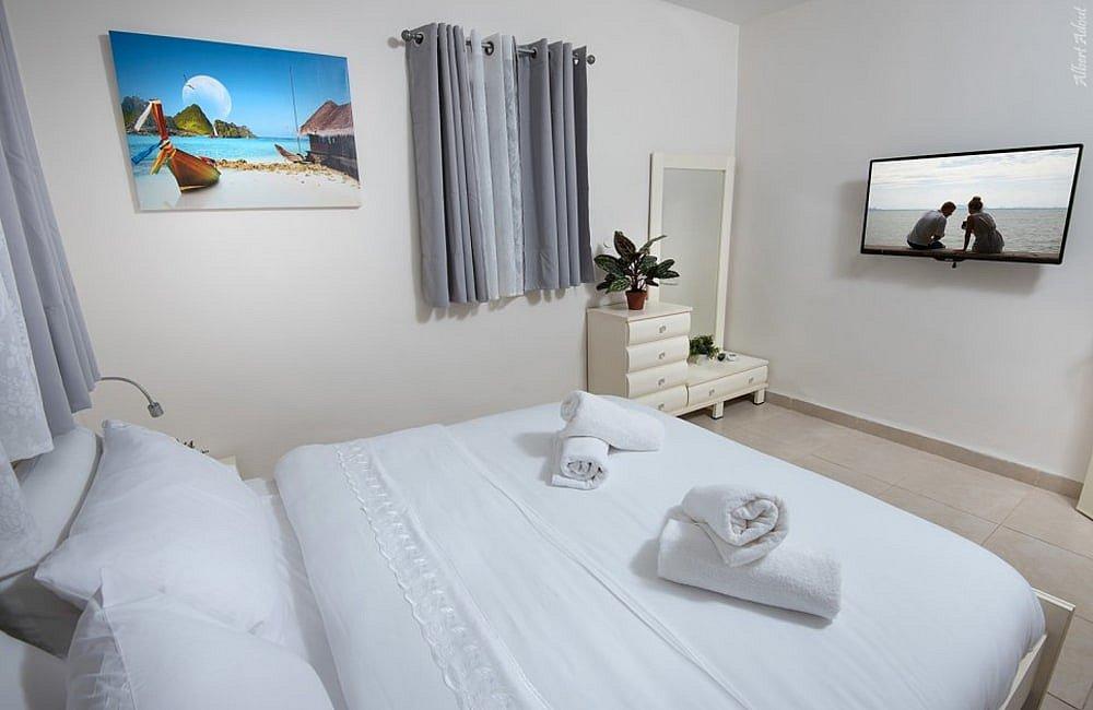 אבזור החדרים: מיטה זוגית, מיזוג אוויר, שידה וטלוויזיה