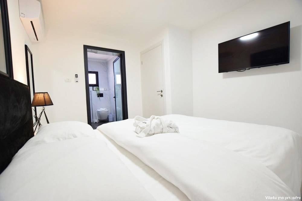 4 חדרי שינה זוגיים הכוללים מיטה זוגית מוצעת, טלוויזיה חכמה, מיזוג אוויר ושידות אחסון