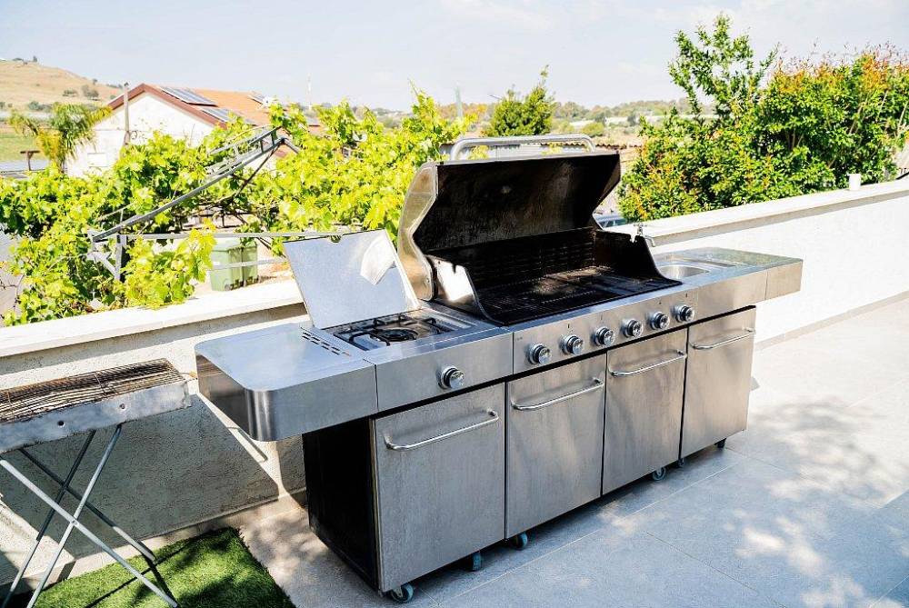 מטבח חיצוני מאובזר לצד עמדת מנגל גז מקצועית ומנגל פחמים ארגנטינאי