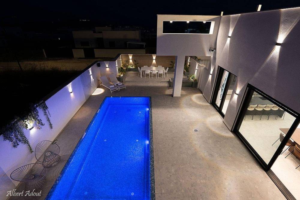 לחצר הוילה תצאו מהקומה הראשונה ושם תגלו חצר ענקית עם בריכת שחייה מחוממת בכל עונות השנה ומקורה בחודשי החורף, מוקפת באזורי ישיבה, מיטות שיזוף, בריכת נוי, תאורה לילית קסומה ומערכת הגברה, ושולחנות משחק: סנוקר ושולחן כדורגל שינעימו לכם את השהייה