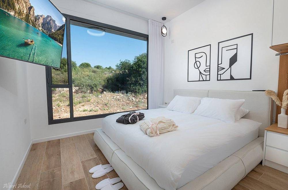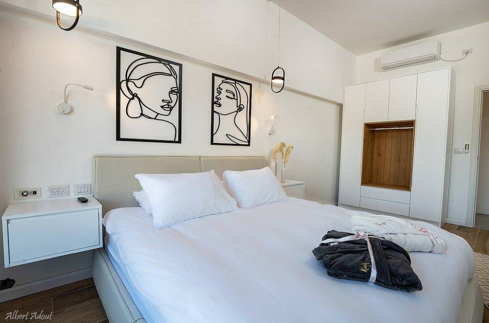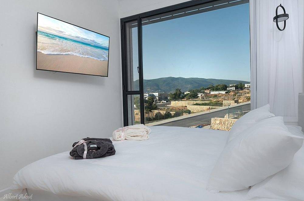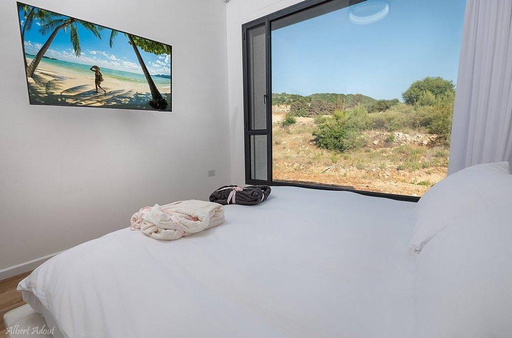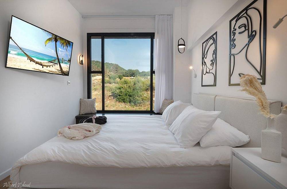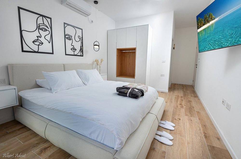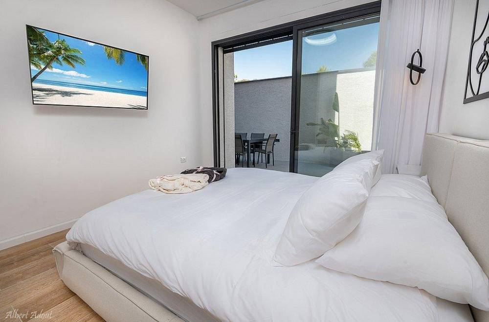 מיטה זוגית מוצעת, מסך צפייה גודל 55 אינץ', שידות, מיזוג אוויר
