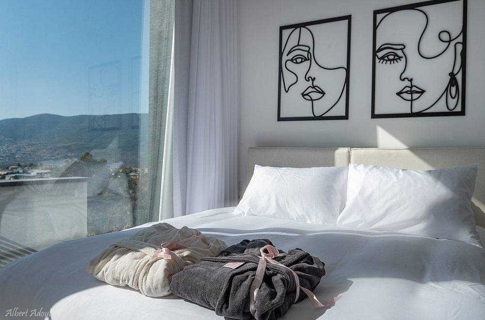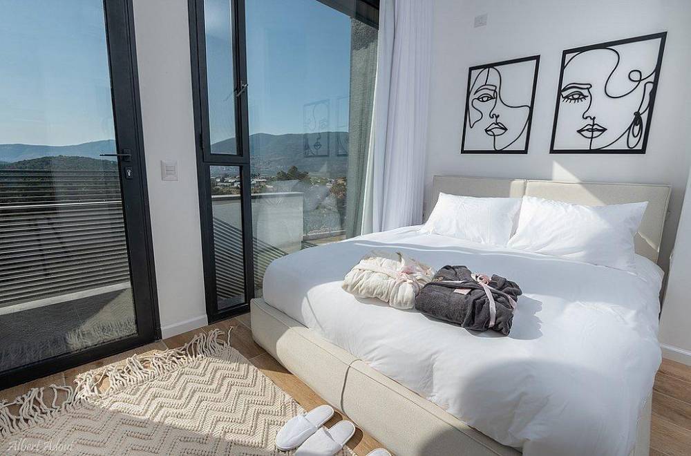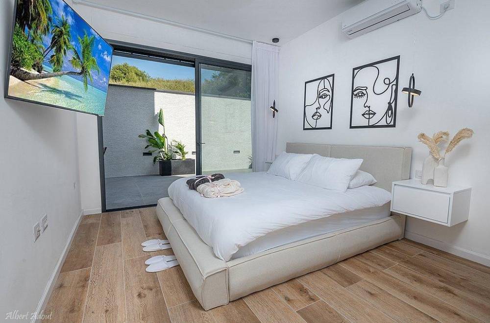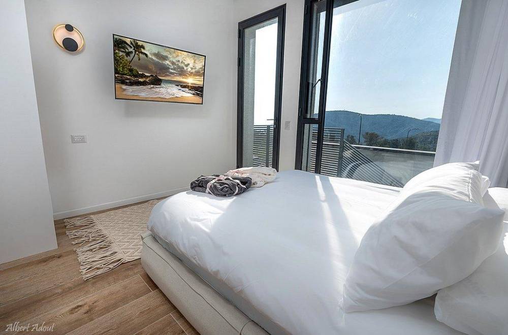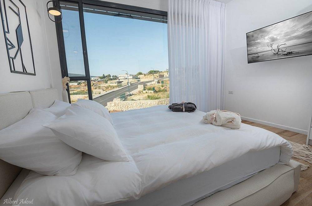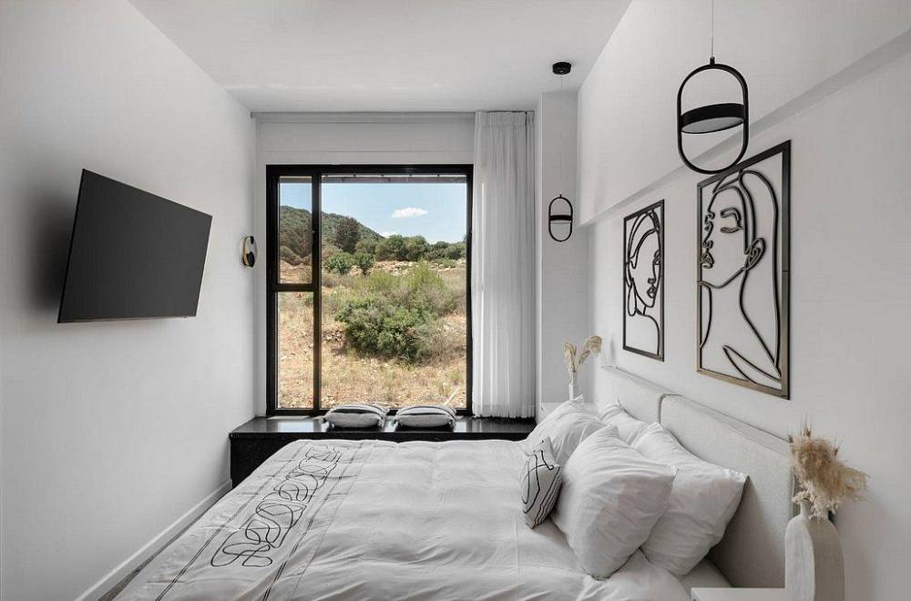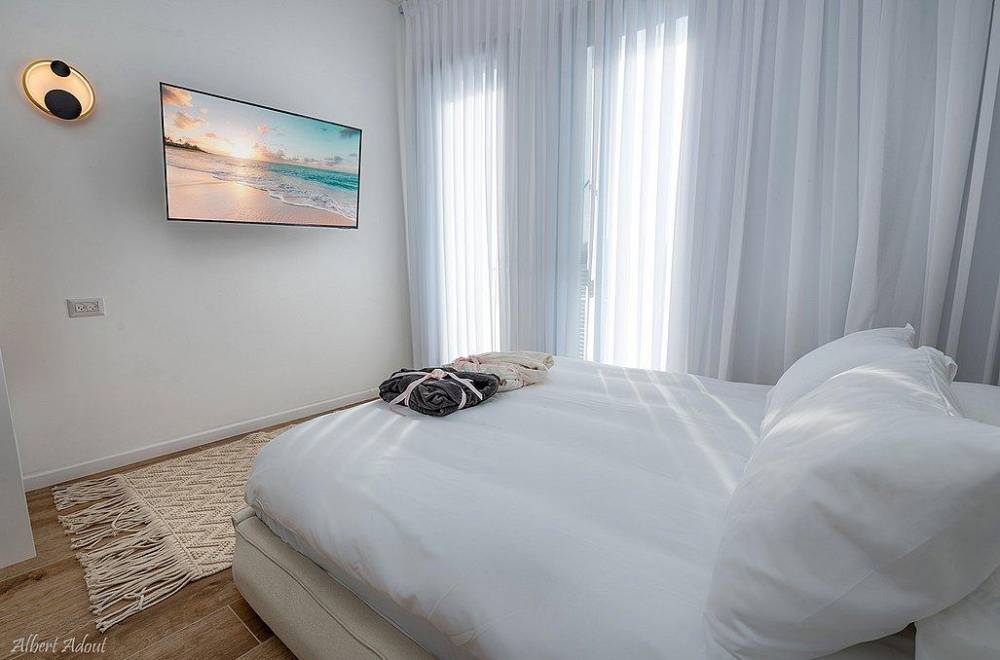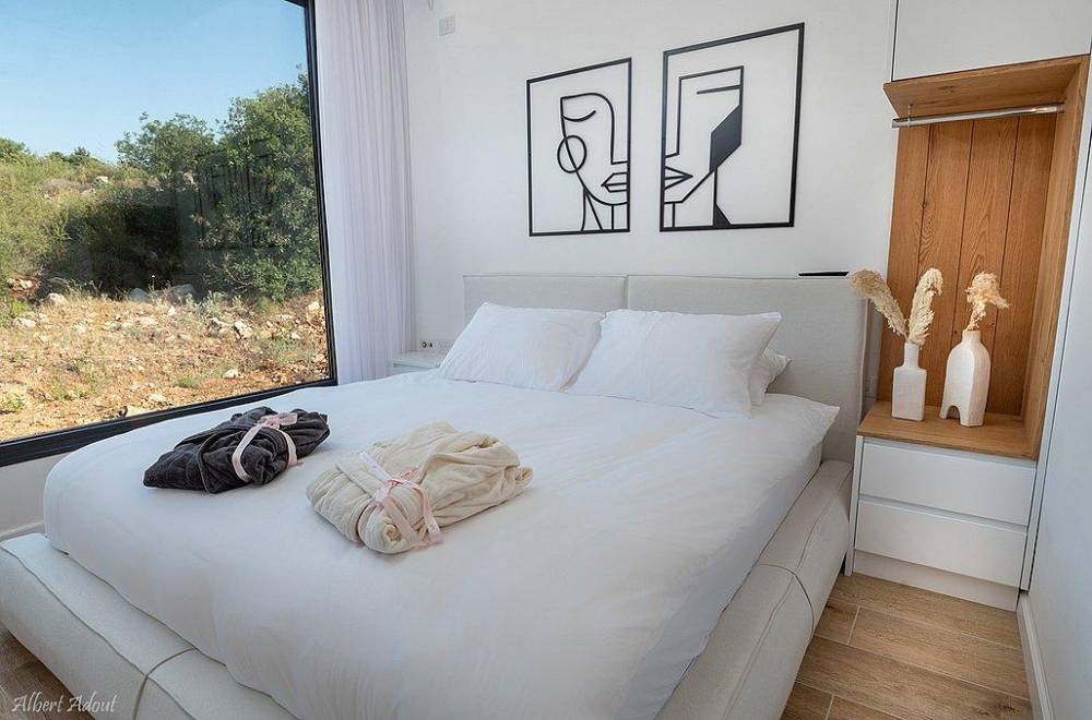 מיטה זוגית מוצעת, מסך צפייה גודל 55 אינץ', שידות, מיזוג אוויר