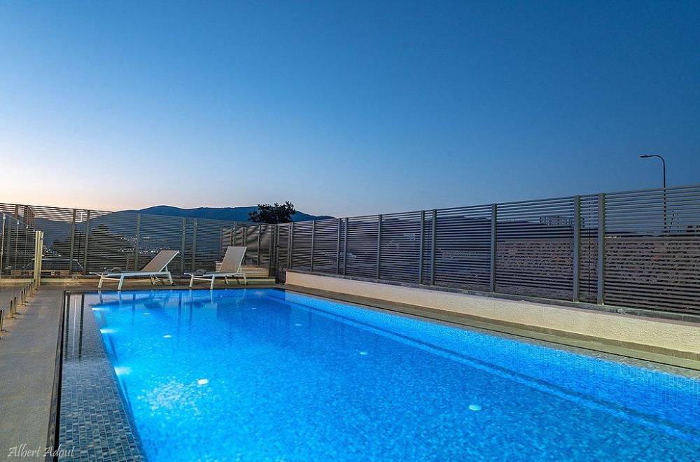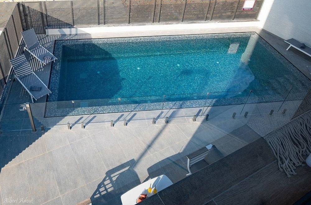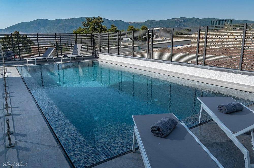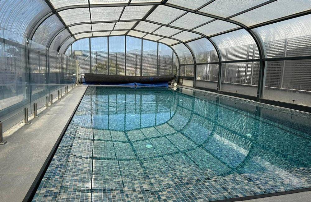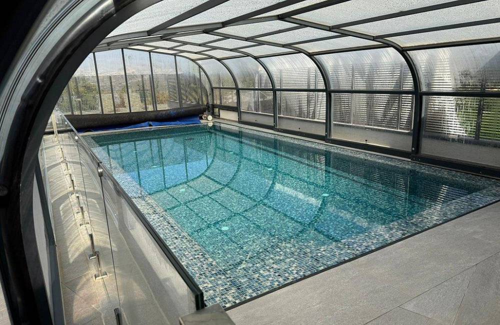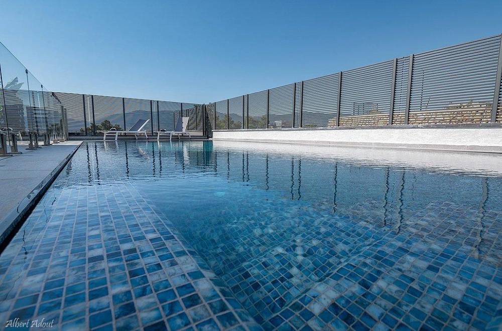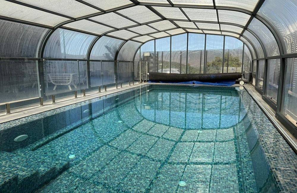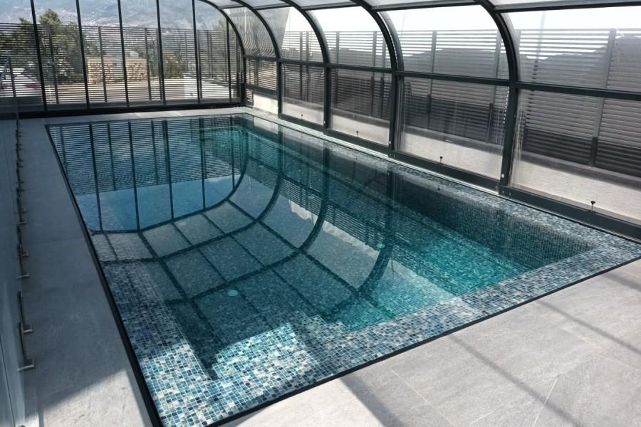 בריכת שחייה בנויה, מחוממת (מקורה בחורף) ומגודרת צופה אל הנוף