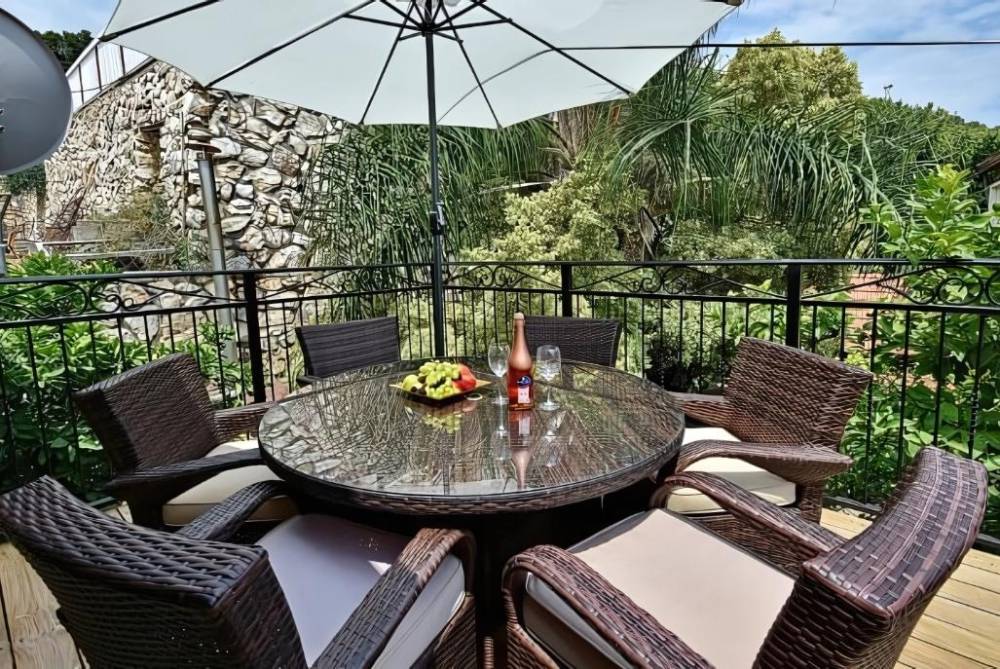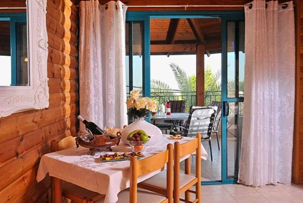 - מרפסת גדולה ומקורה הצופה לנוף רמת הגולן והחרמון עם פינת אוכל. המרפסת משותפת עם חדר הפרימיום.