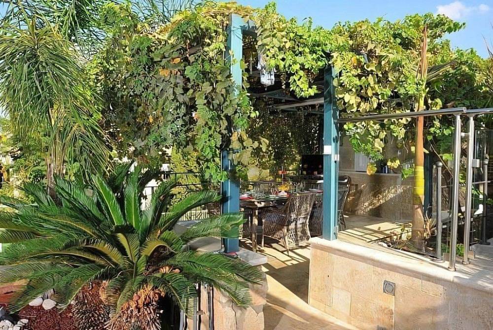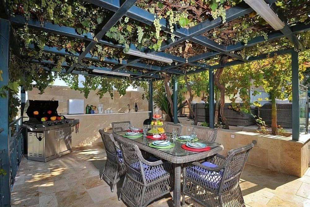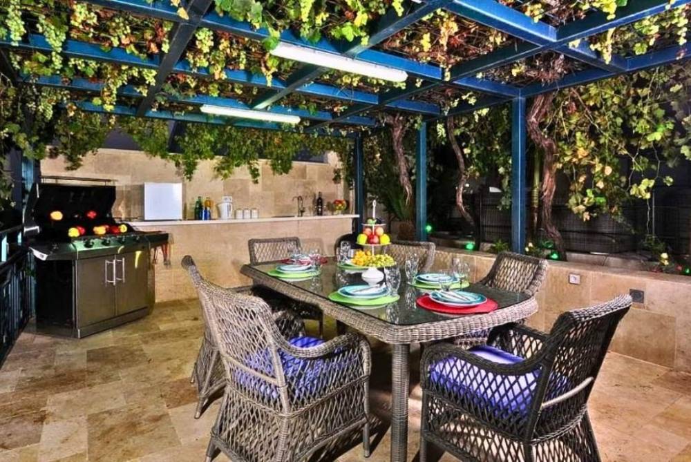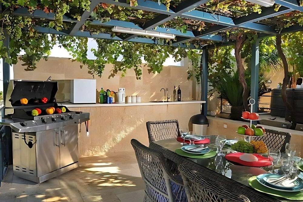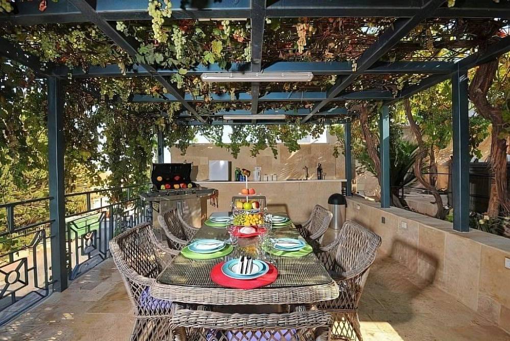 - מטבח חוץ מאובזר הכולל: תנור אפייה, כיריים גז, מקרר חוץ גדול, בר מים, פינת קפה וקומקום חשמלי.