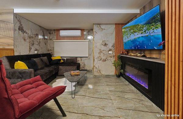 סלון: מסך טלוויזיה, ספה נפתחת וקמין חשמלי