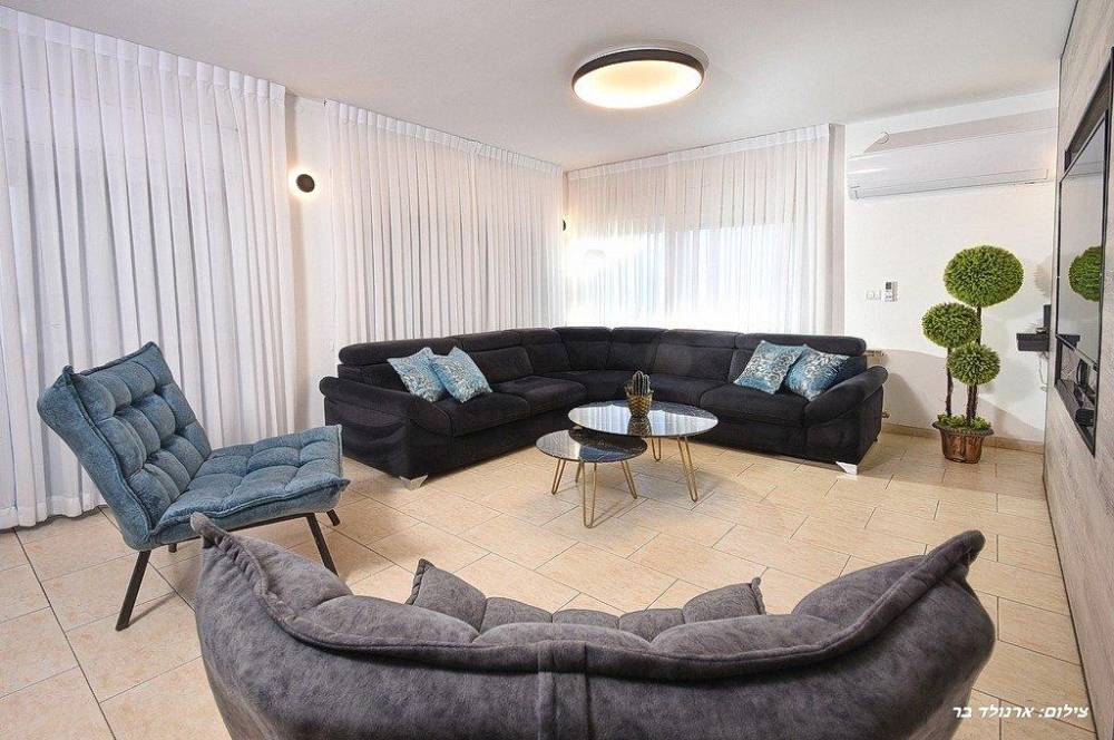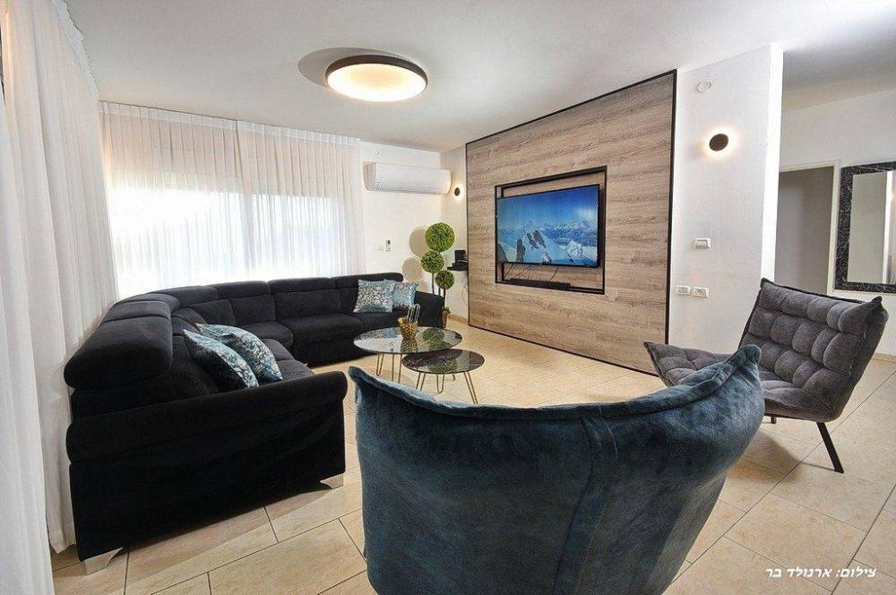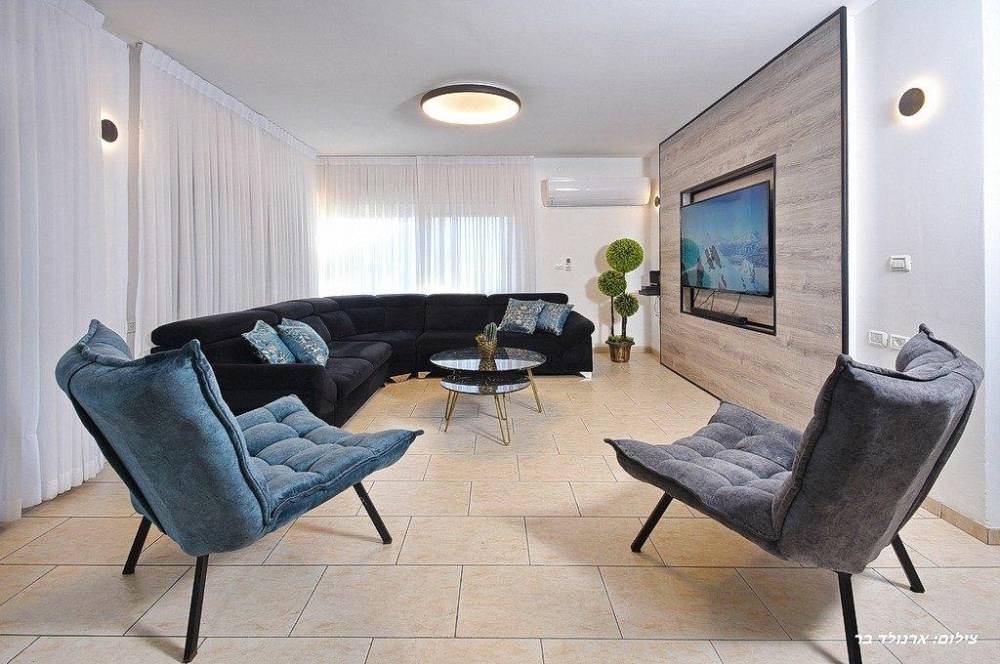 סלון מרווח עם מערכת ישיבה, כורסאות וטלוויזיה.