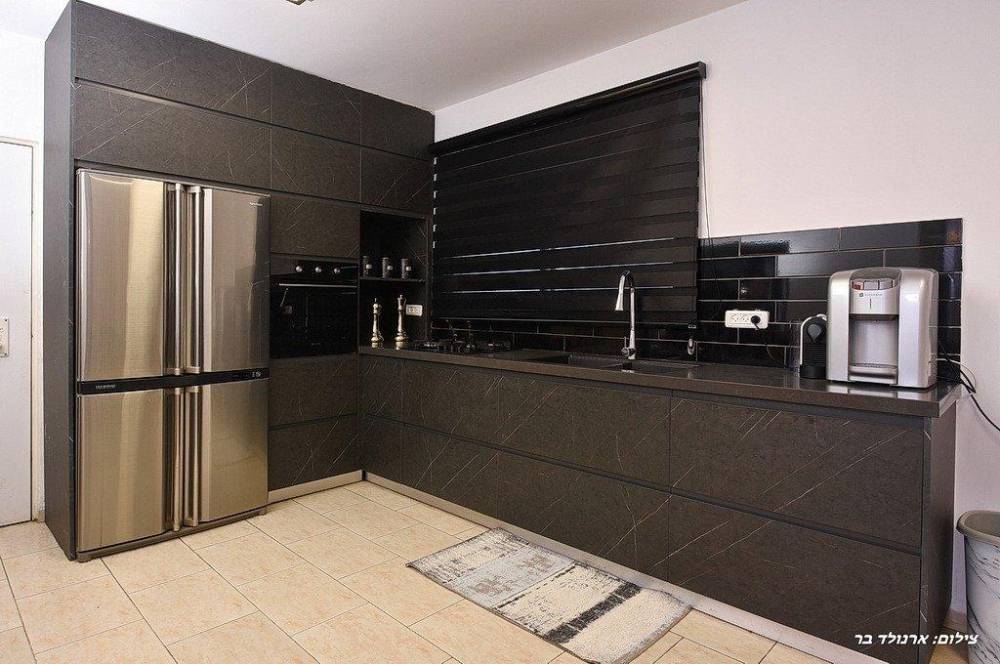 מטבח מאובזר הכולל מקרר, מיקרוגל, תמי4, קומקום חשמלי, תנור אפייה, כיריים, כלי אוכל והגשה.