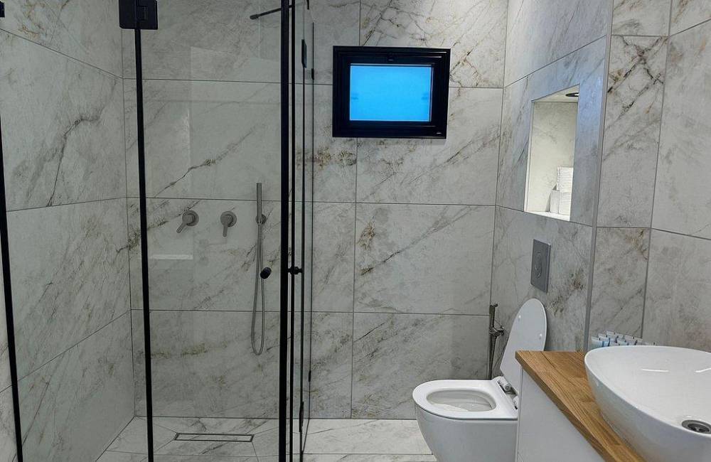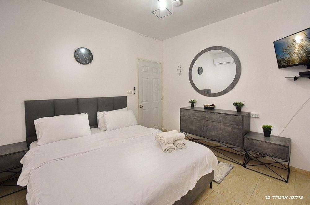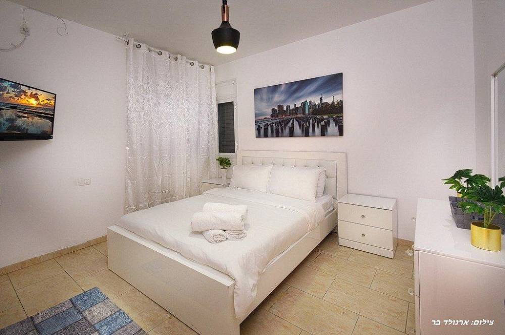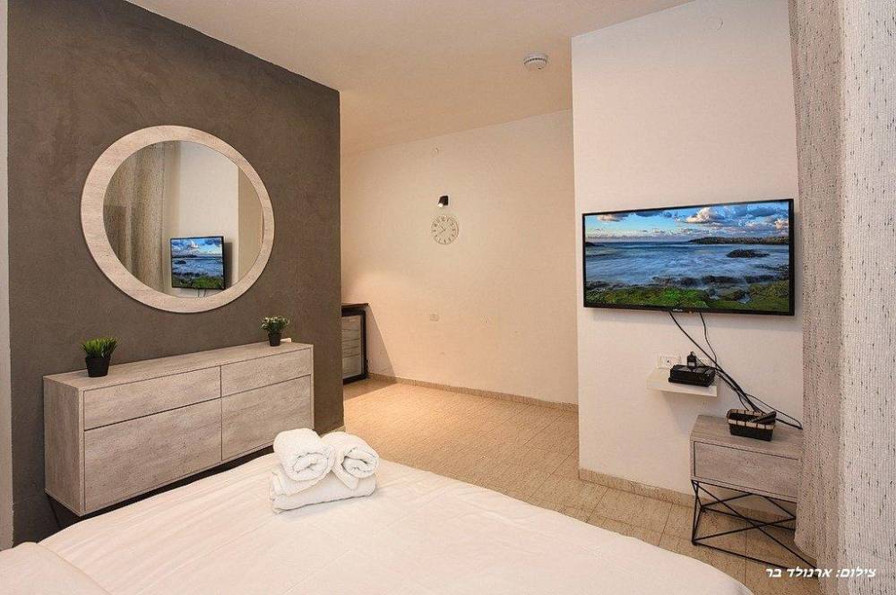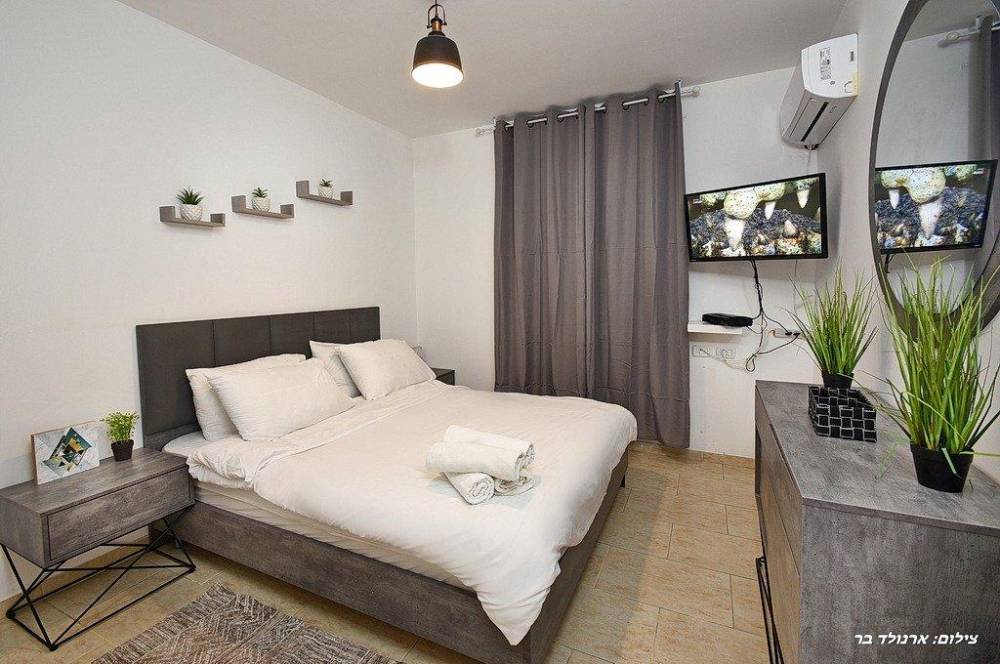 מיטה זוגית, טלוויזיה, מיזוג אוויר, ארונות ושידות אחסון.