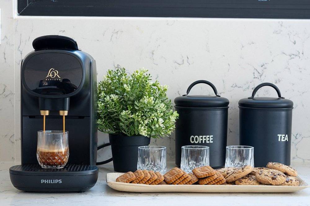 מטבח מאובזר הכולל מקרר, מיקרוגל, תנור, כיריים חשמליים, כלי בישול, מכונת קפה ובר מים