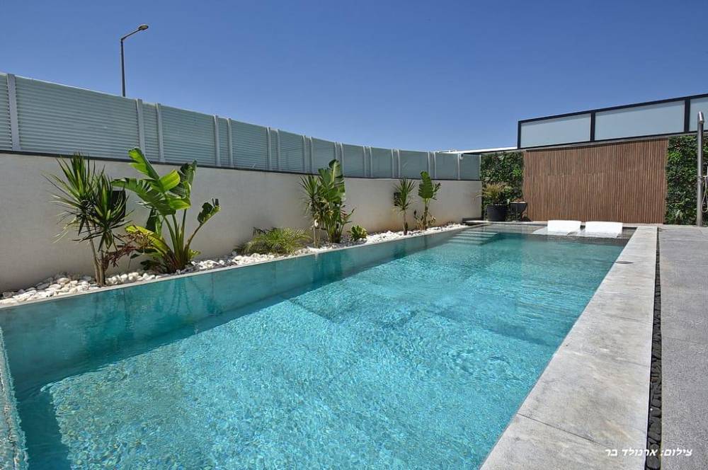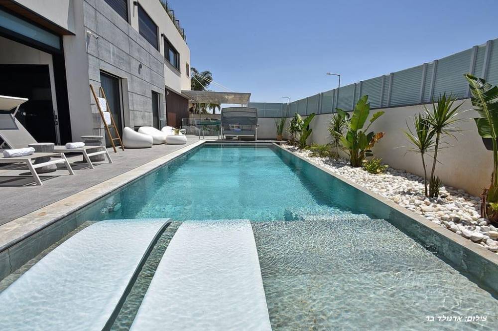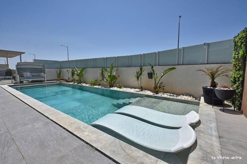 בריכת שחייה גדולה (מחוממת ומקורה בעונת החורף) ומסביבה מיטות שיזוף, פינות ישיבה ועוד.