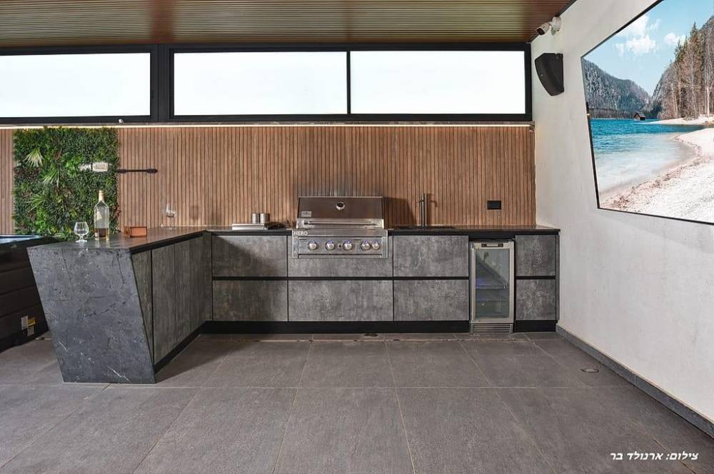 מטבח חוץ מאובזר הכולל משטח עבודה, מנגל גז, כירה חשמלית, כיור ומקרר קטן.