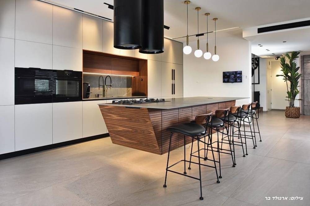 מטבח מאובזר הכולל - אי צף עם כסאות בר וכיריים גז, 2 תנורים, מיקרוגל, מתקן מים, כיור, מקרר אינטגרלי, כלי אוכל והגשה.