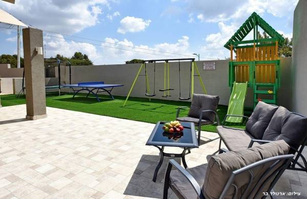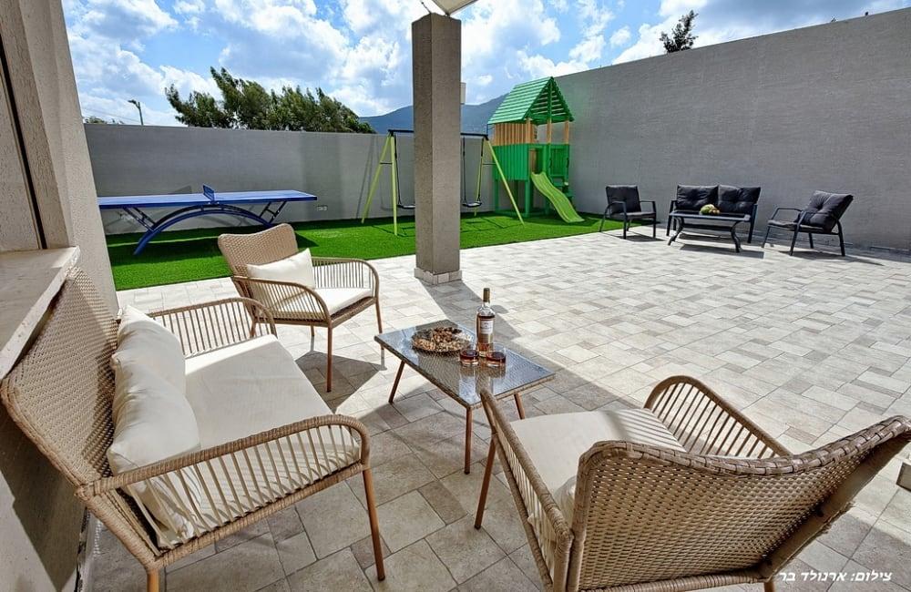 חצר ענקית עם שולחן פינג פונג, ברביקיו ומטבחון חוץ
