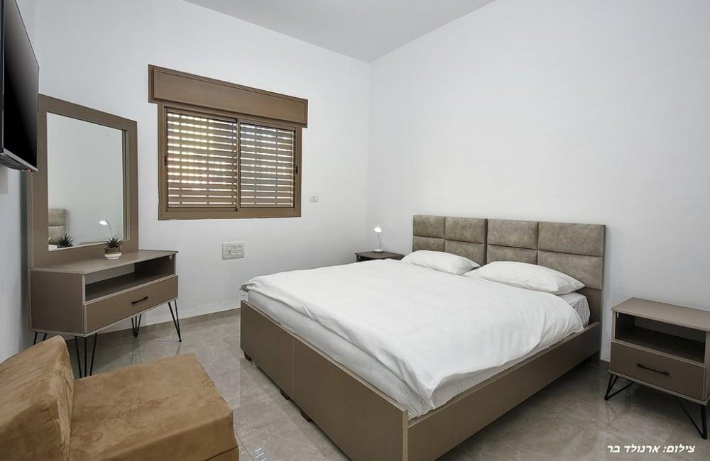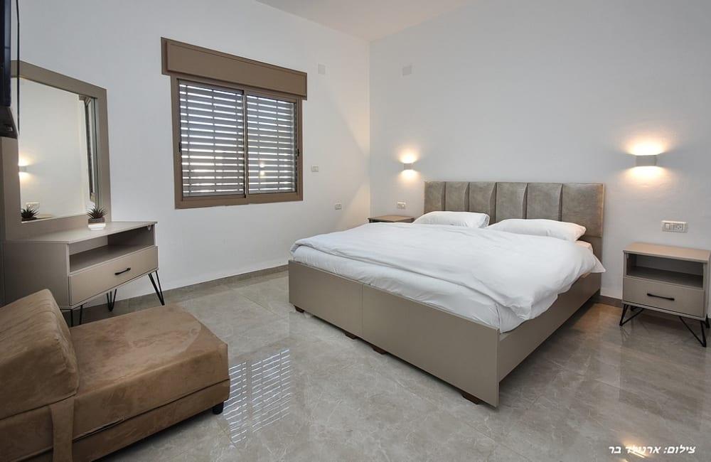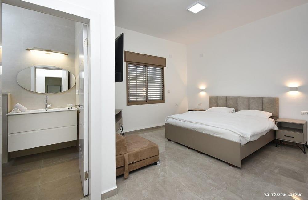 - הסוויטה: מיטה זוגית, 2 מיטות יחיד, שידות לאחסון, ארון גדול, מסך טלוויזיה, חדר רחצה פרטי, מיזוג אוויר.
