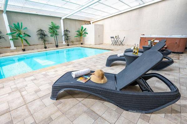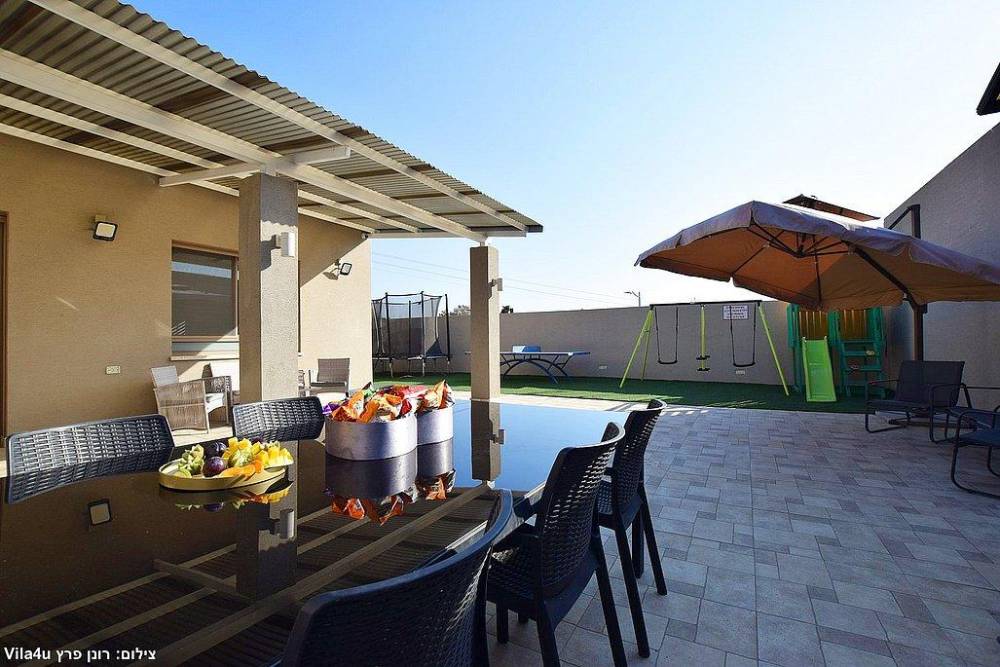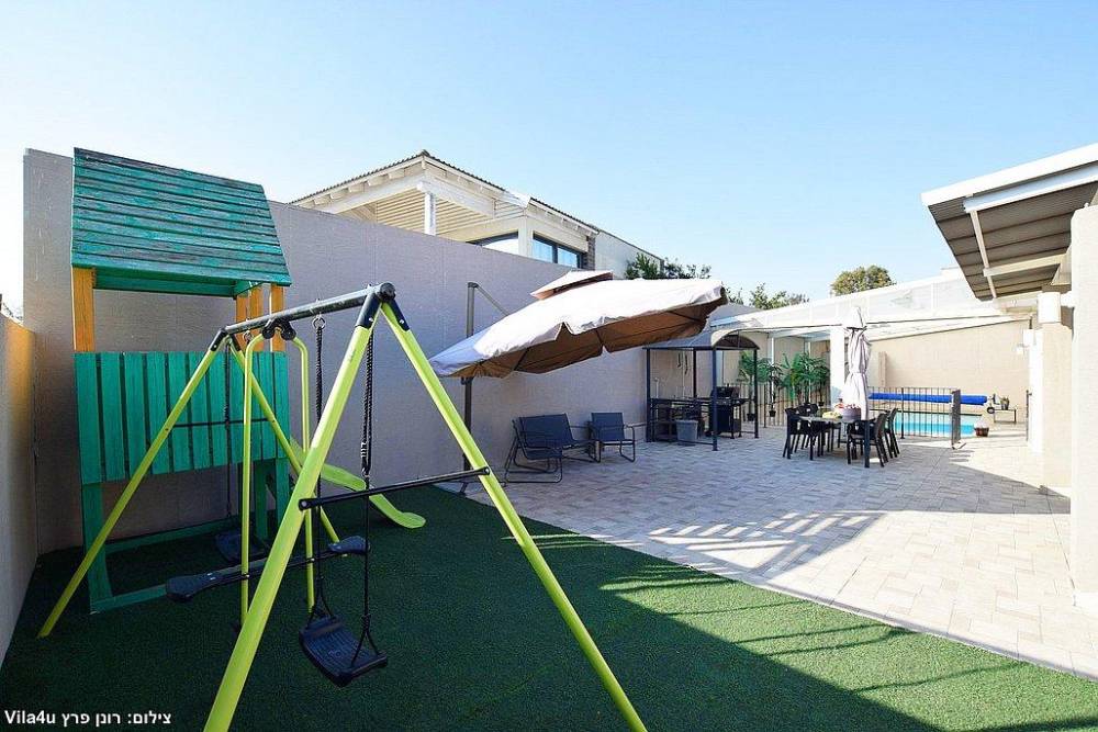 החצר? חוויה בפני עצמה: בריכה פרטית מחוממת ומקורה, ג’קוזי ספא, מיטות שיזוף, פינות ישיבה, שולחן פינג פונג, ברביקיו ומטבחון, ועוד שטח משחקים לילדים עם בית עץ, נדנדות וטרמפולינה.