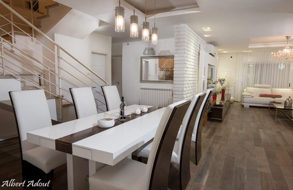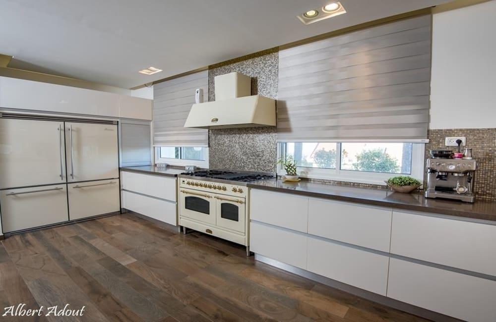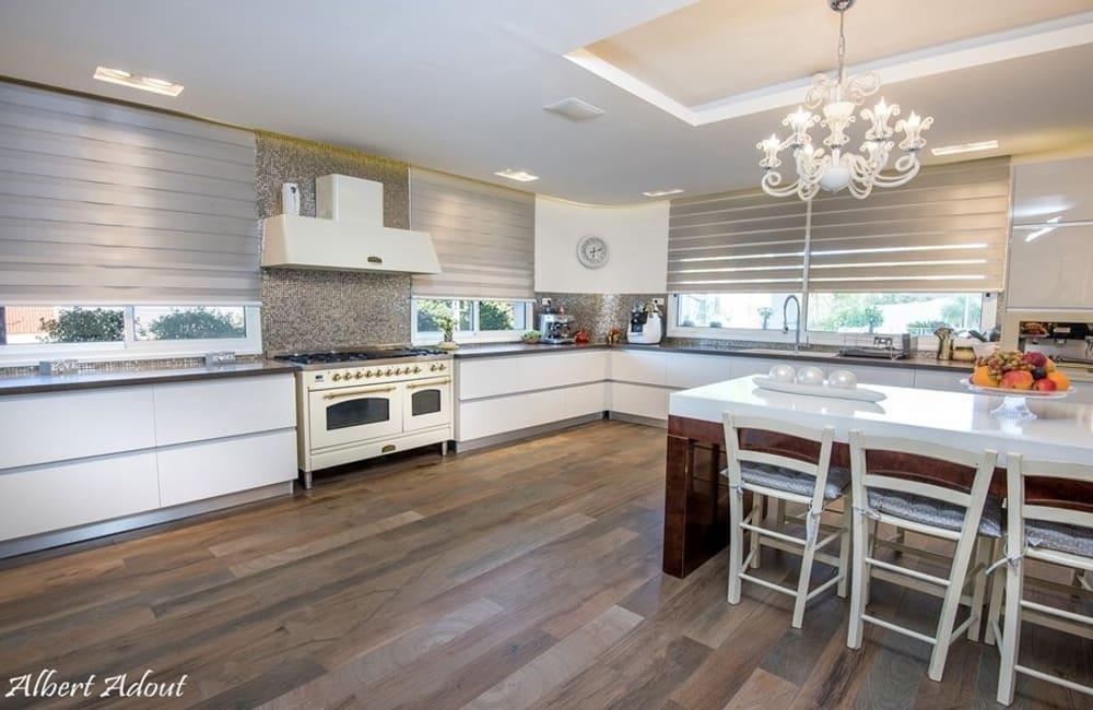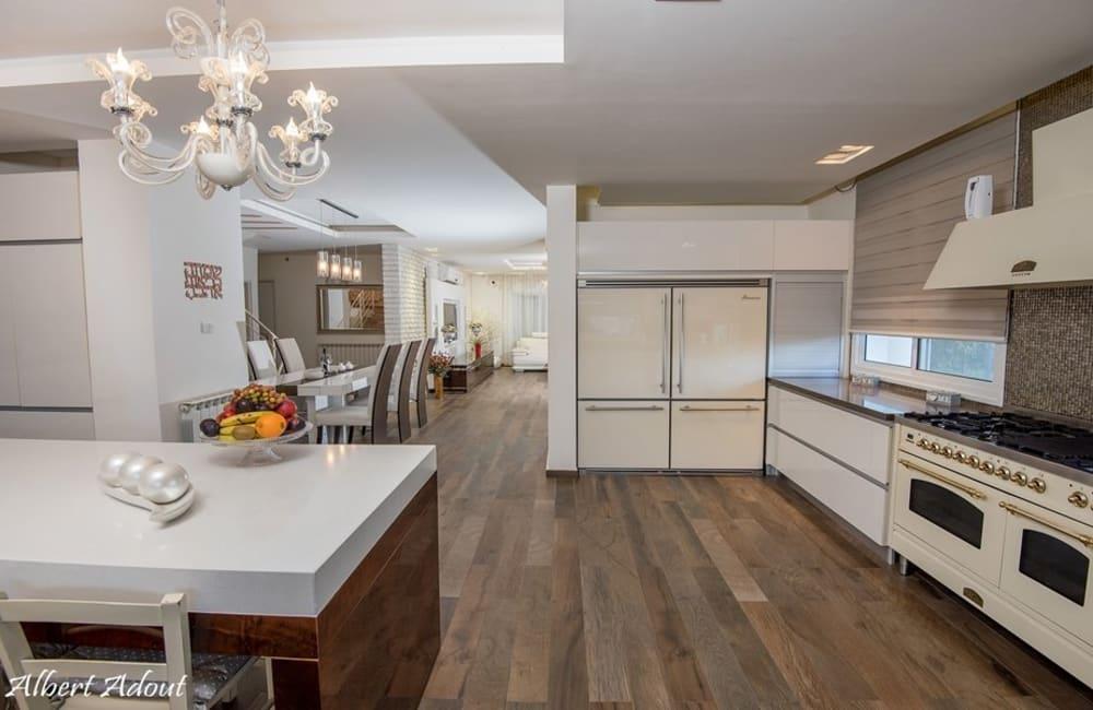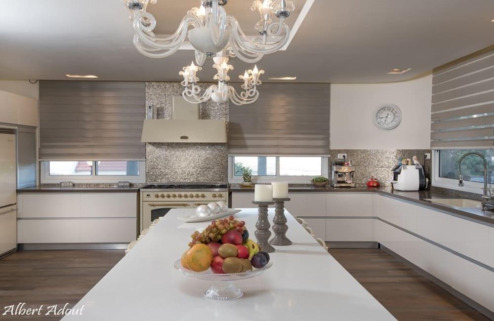מטבח כשר ומקצועי הכולל, אי גדול עם כיסאות בר במרכז, מפריד בין המטבח הבשרי למטבח החלבי
