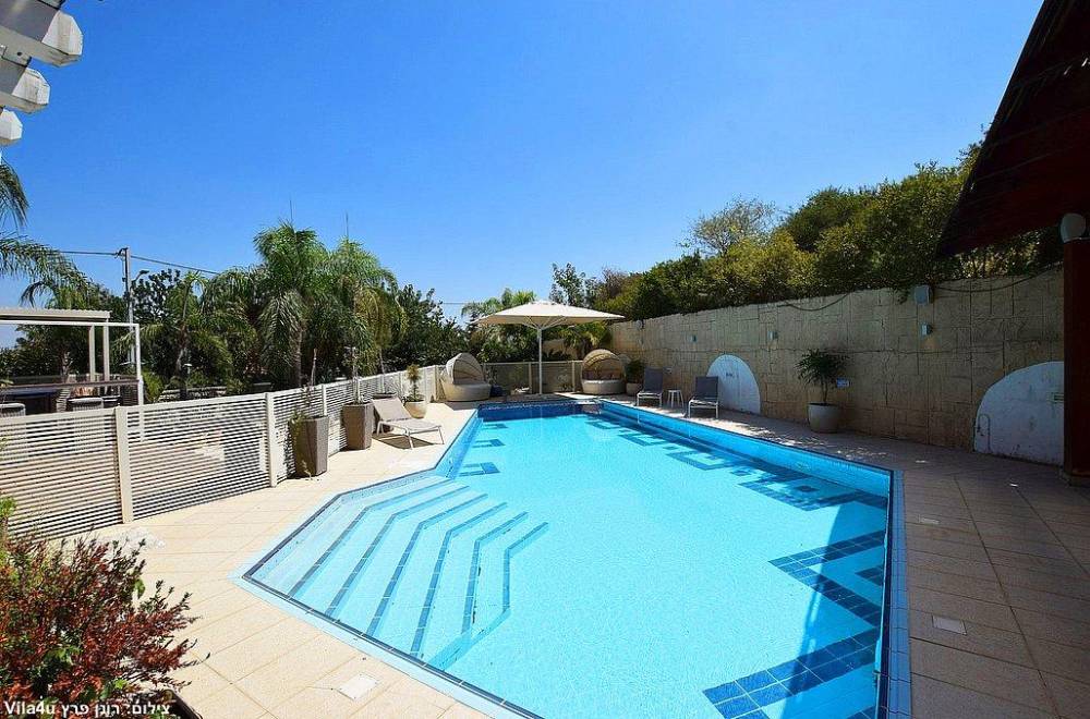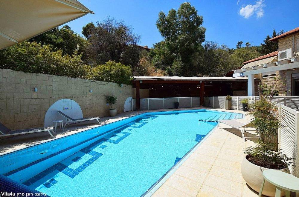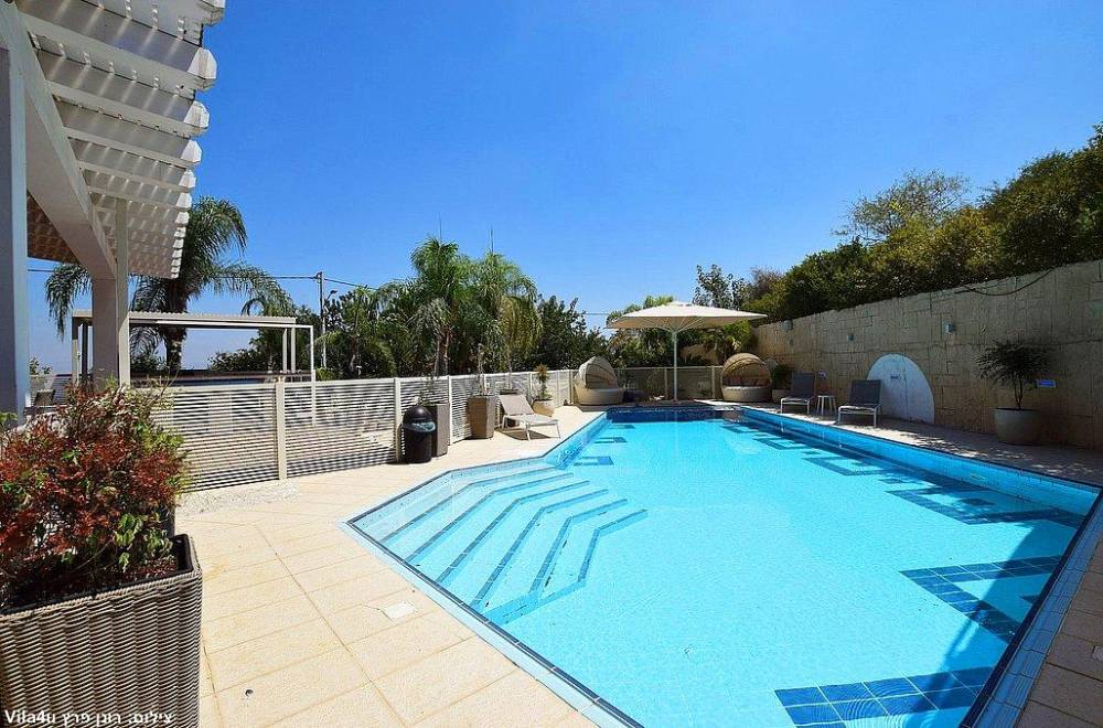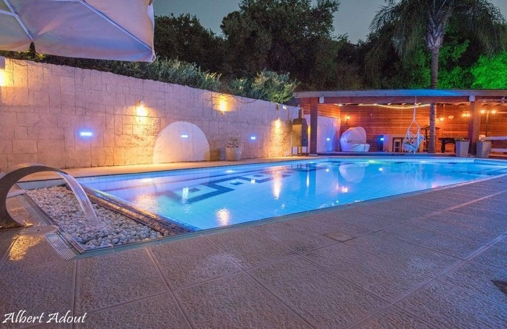 בריכת שחיה פרטית מחוממת ובנויה בגודל 5/12 מ' עם מפל מים ומיטות שיזוף מפנקות