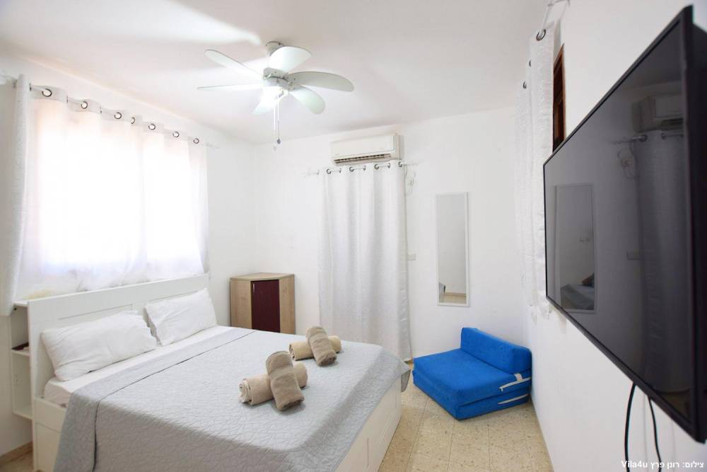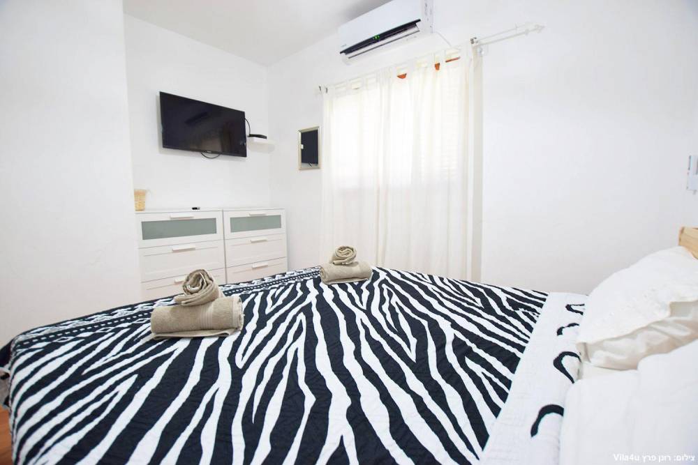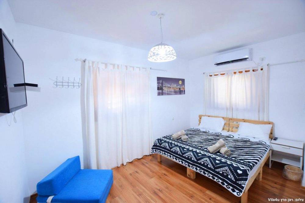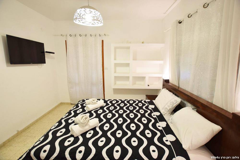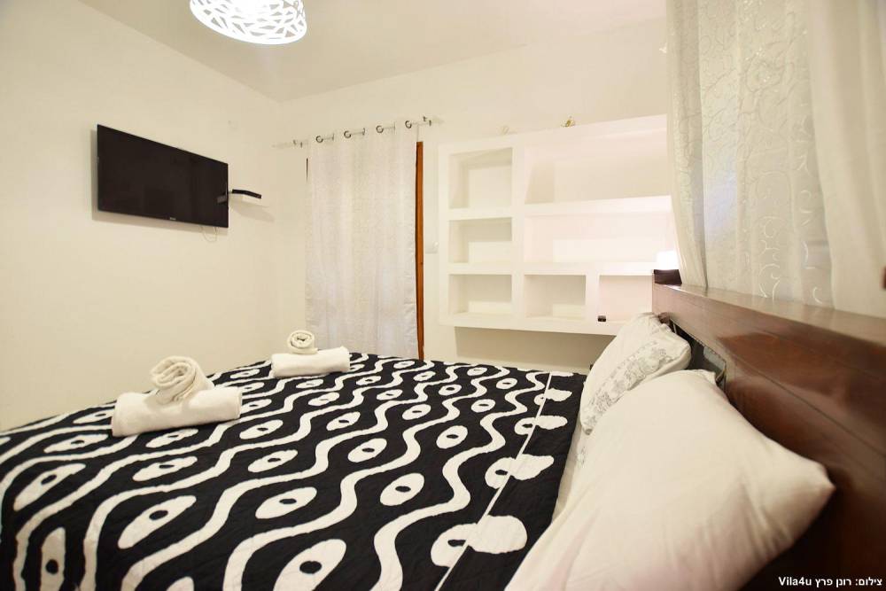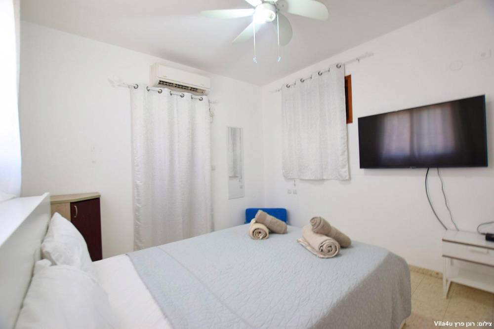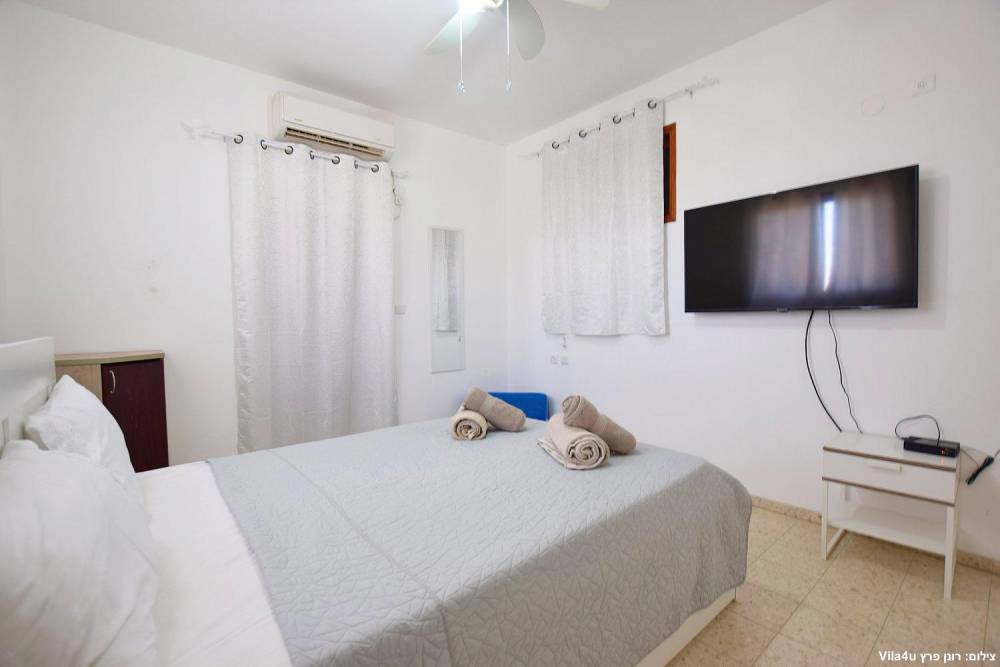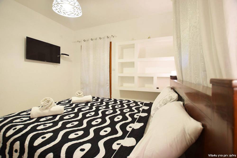 חדר שינה 5- מיטה זוגית, מיזוג אוויר, טלוויזיה עם חיבור ל-HOT, שידות וארונות לאחסון ומנורת לילה
