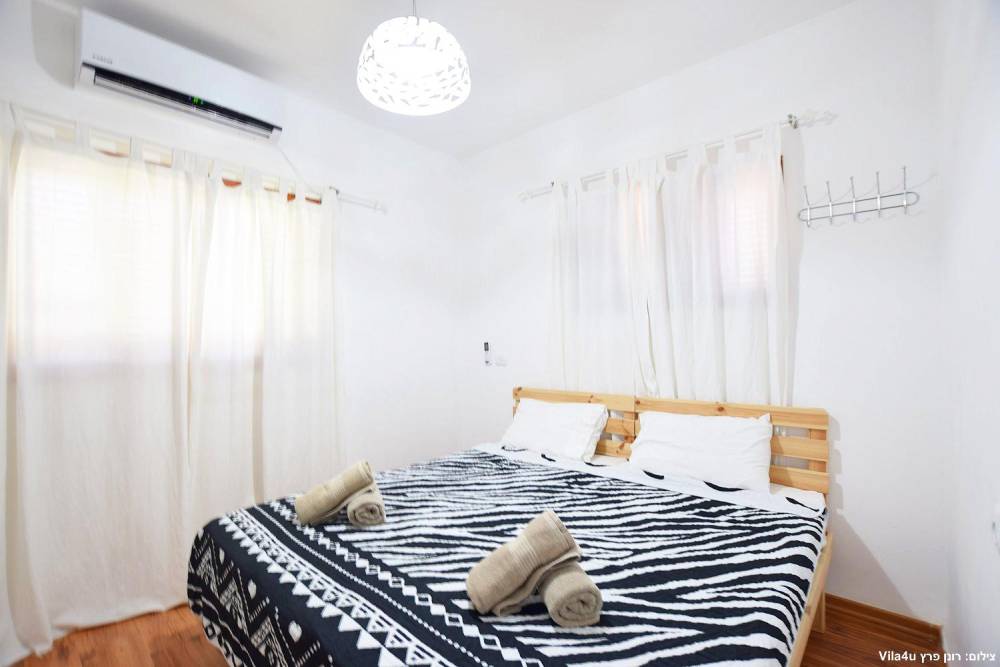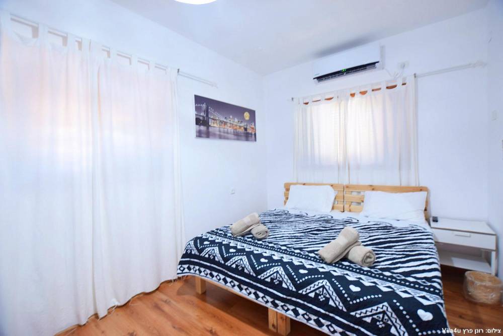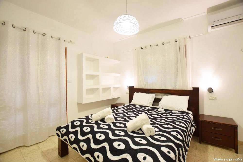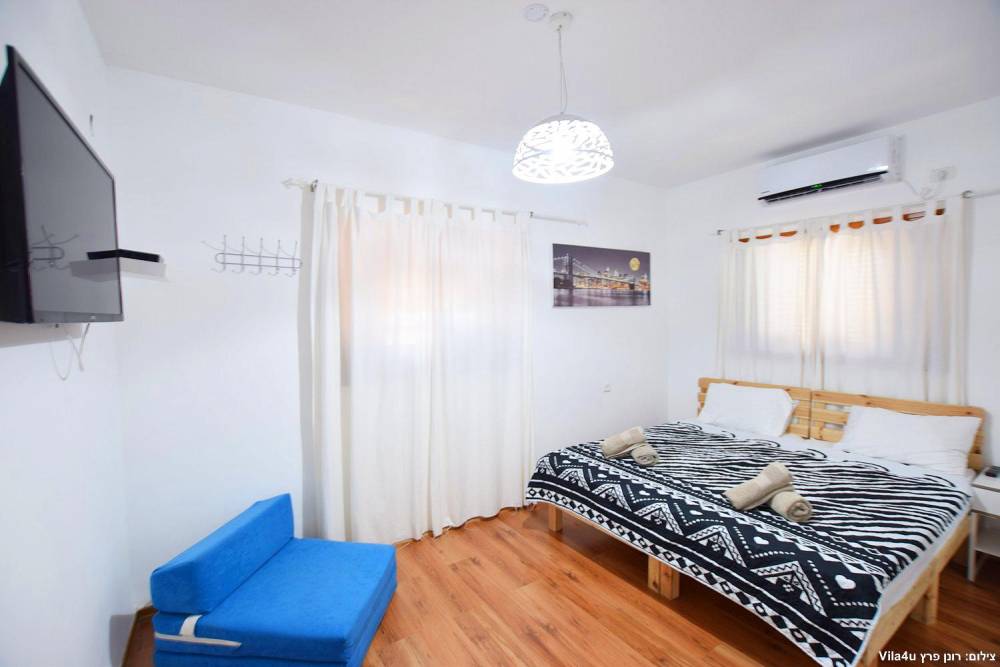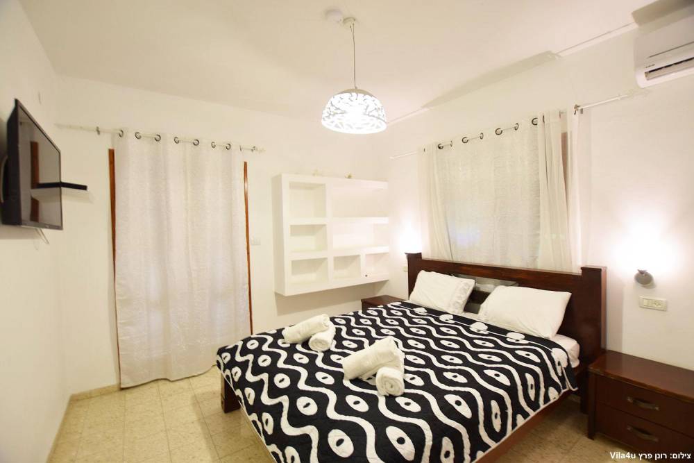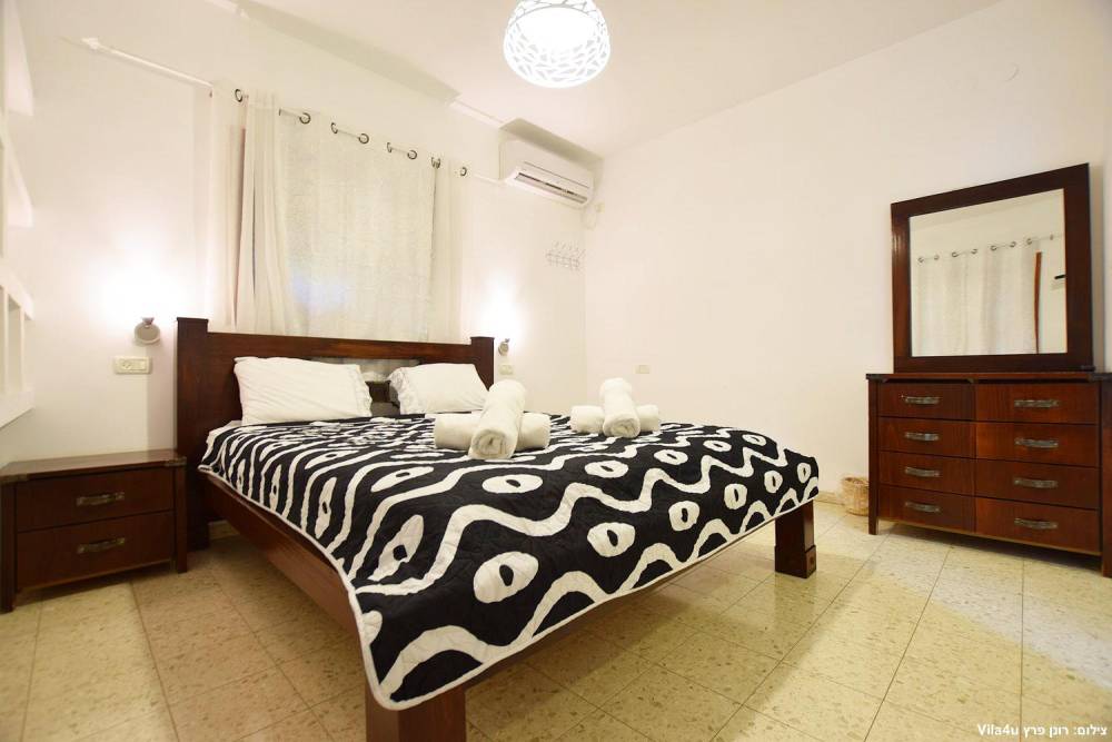 חדר שינה 1- סוויטת הורים- מיטה זוגית, מיזוג אוויר, טלוויזיה עם חיבור ל-HOT, חדר רחצה פרטי, שידות וארונות לאחסון ומנורת לילה