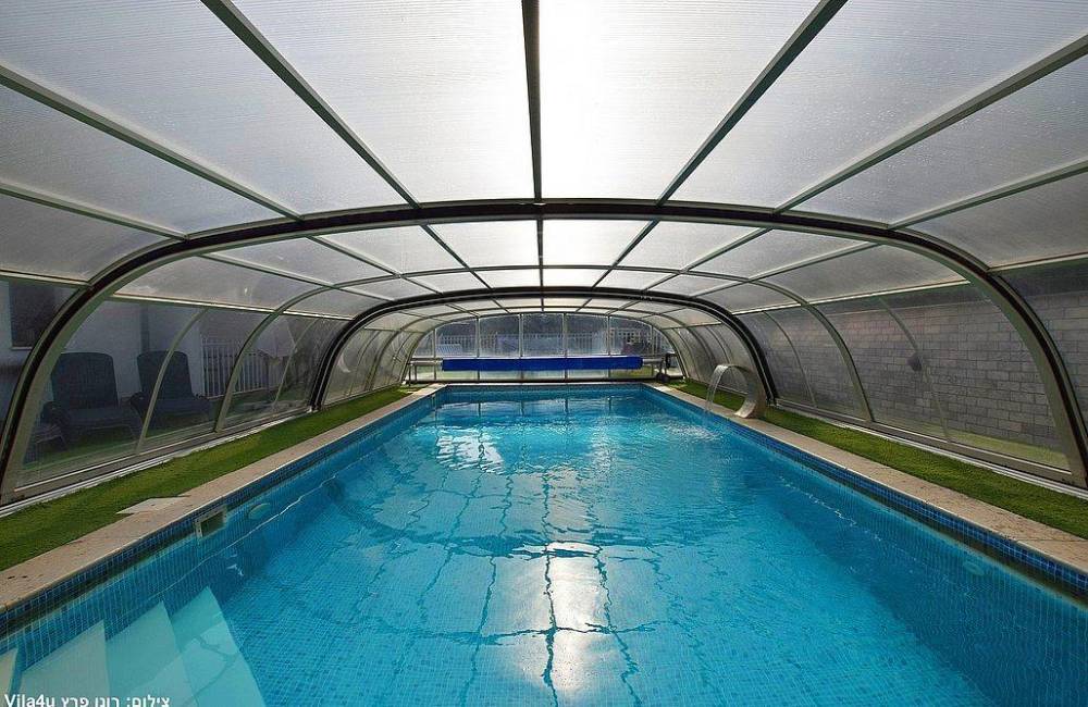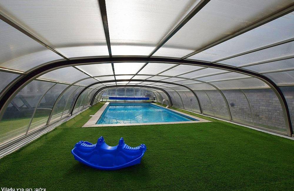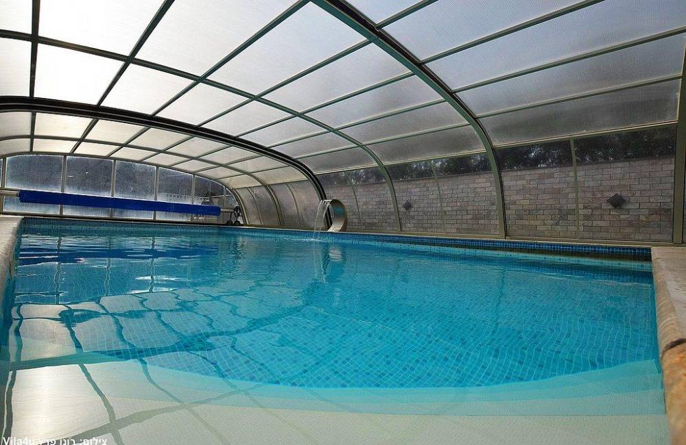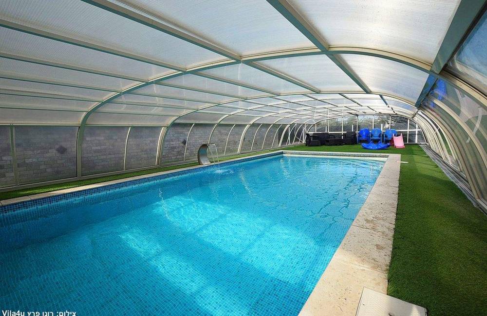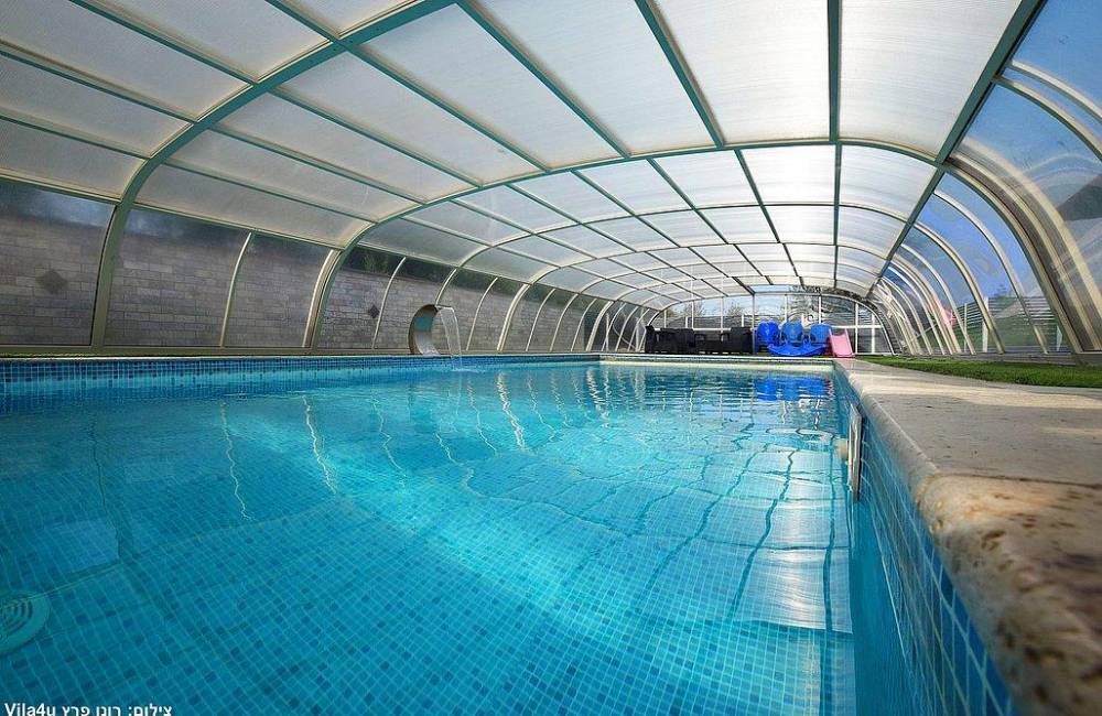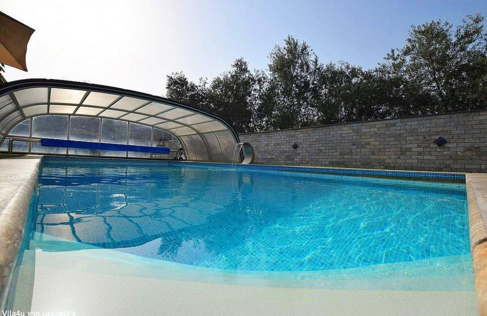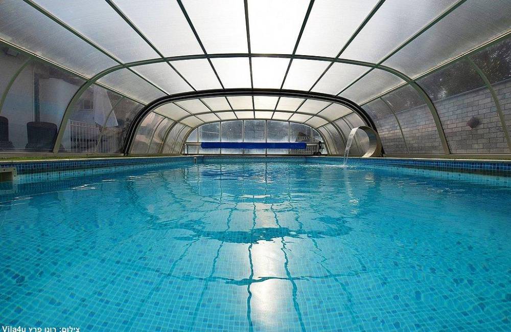 בריכת שחייה צלולה בגודל 9X4 עם מפל ותאורה לילית קסומה, הבריכה מחוממת ומקורה