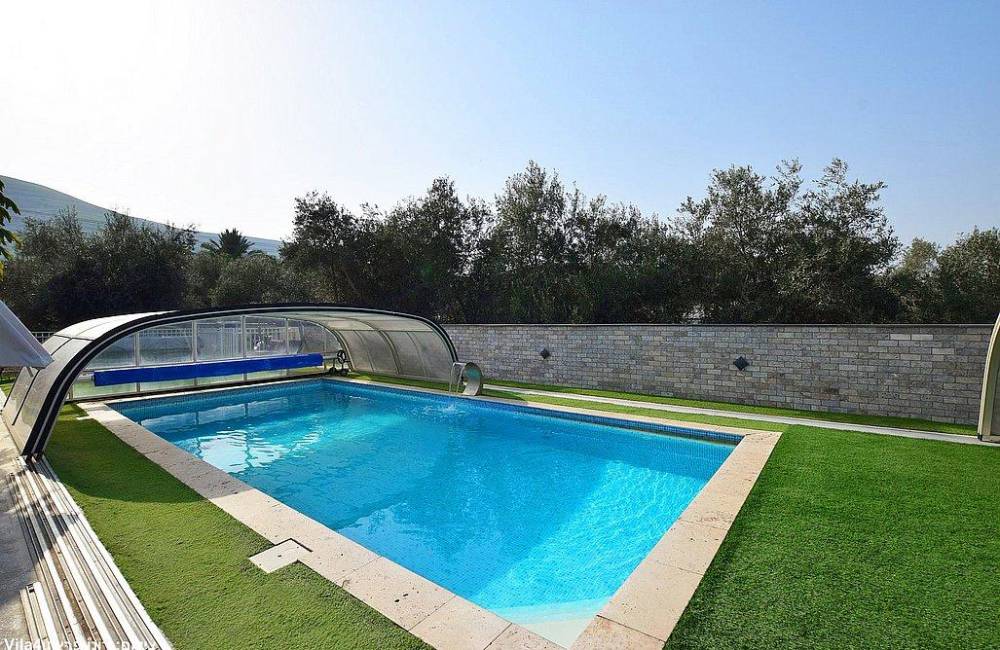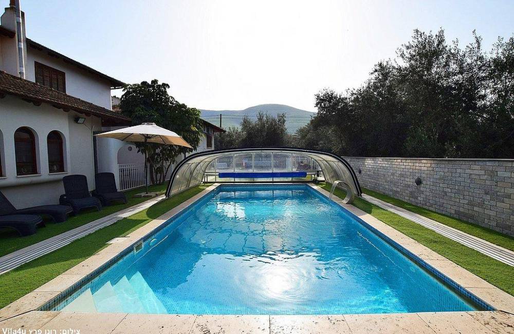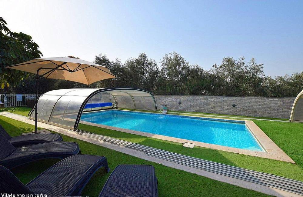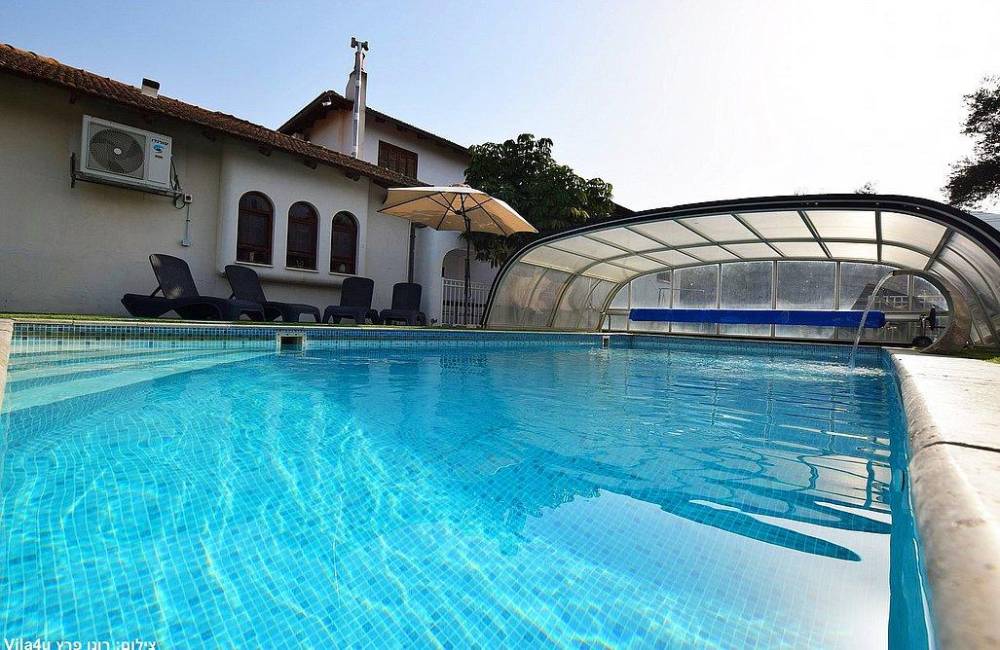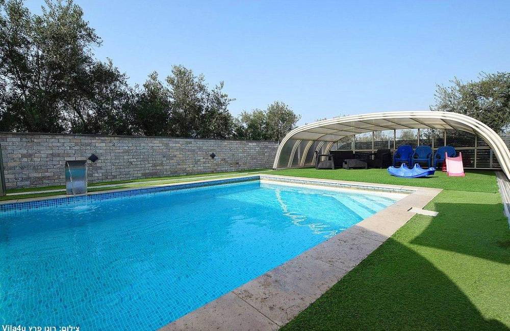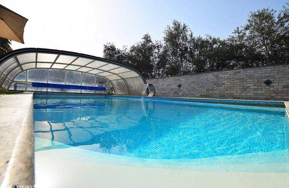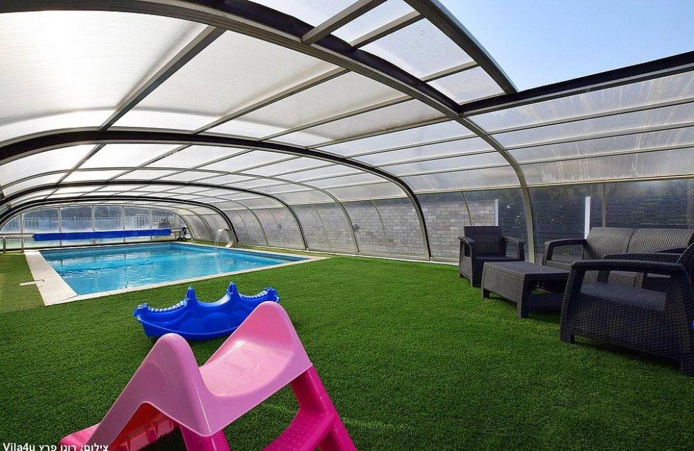 בריכת שחייה צלולה בגודל 9X4 עם מפל ותאורה לילית קסומה, הבריכה מחוממת ומקורה