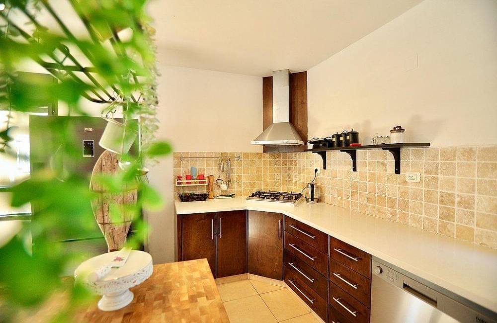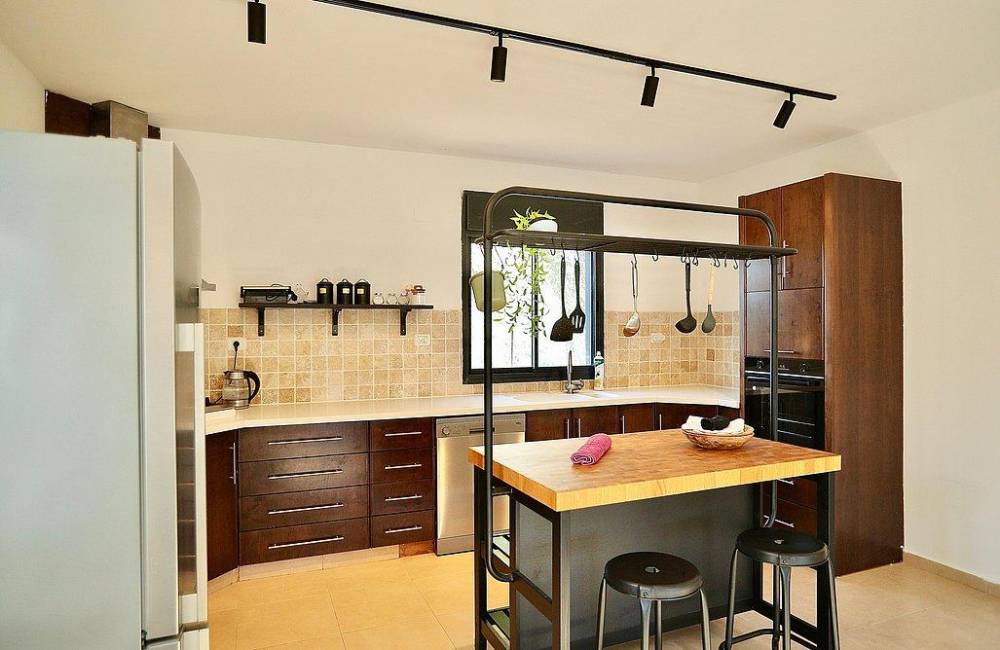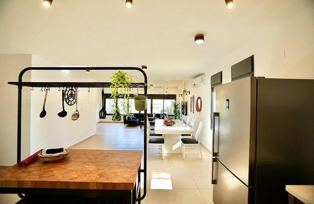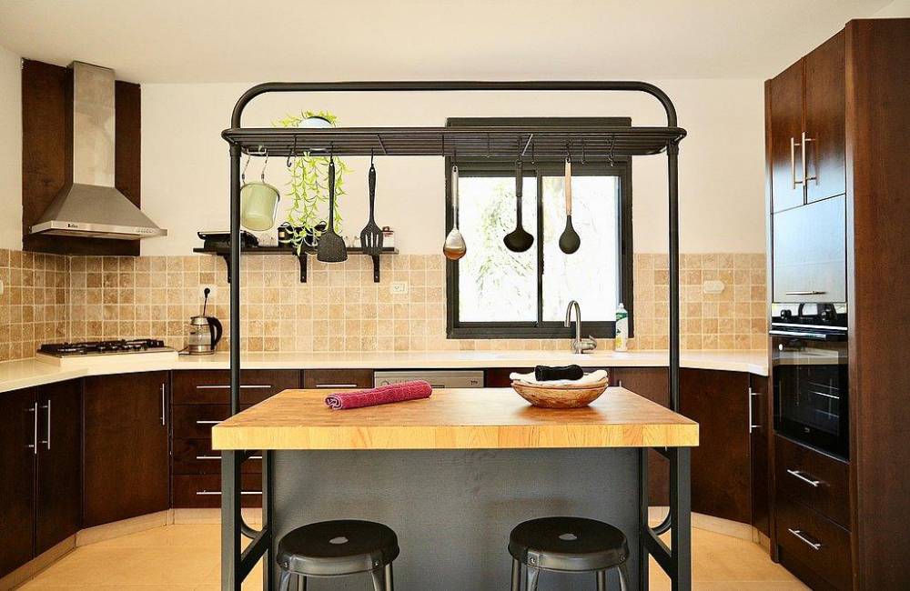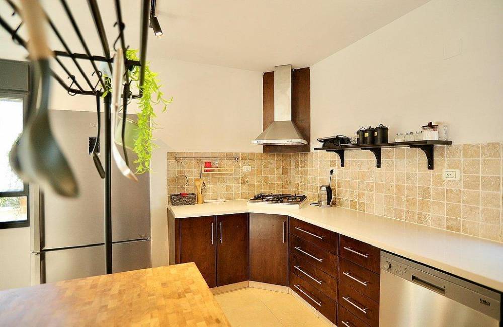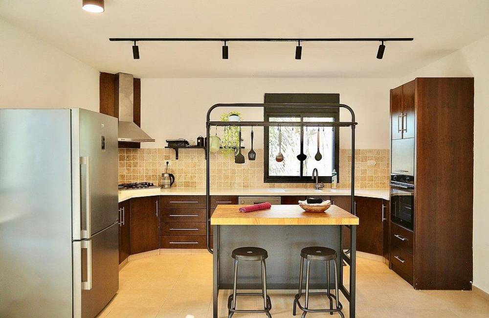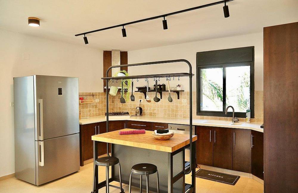 מטבח מאובזר הכולל: מקרר, מיקרוגל, תנור, כיריים גז, קומקום חשמלי, טוסטר, פלטה ומיחם, כלי אוכל והגשה